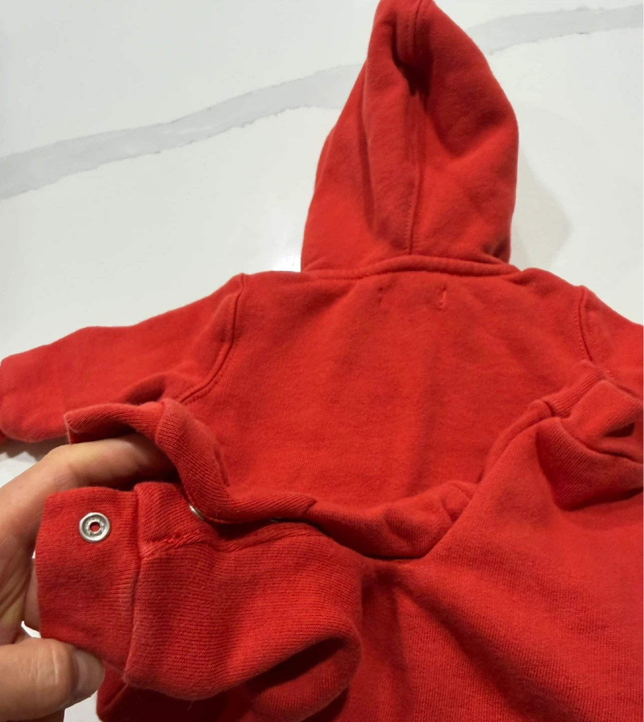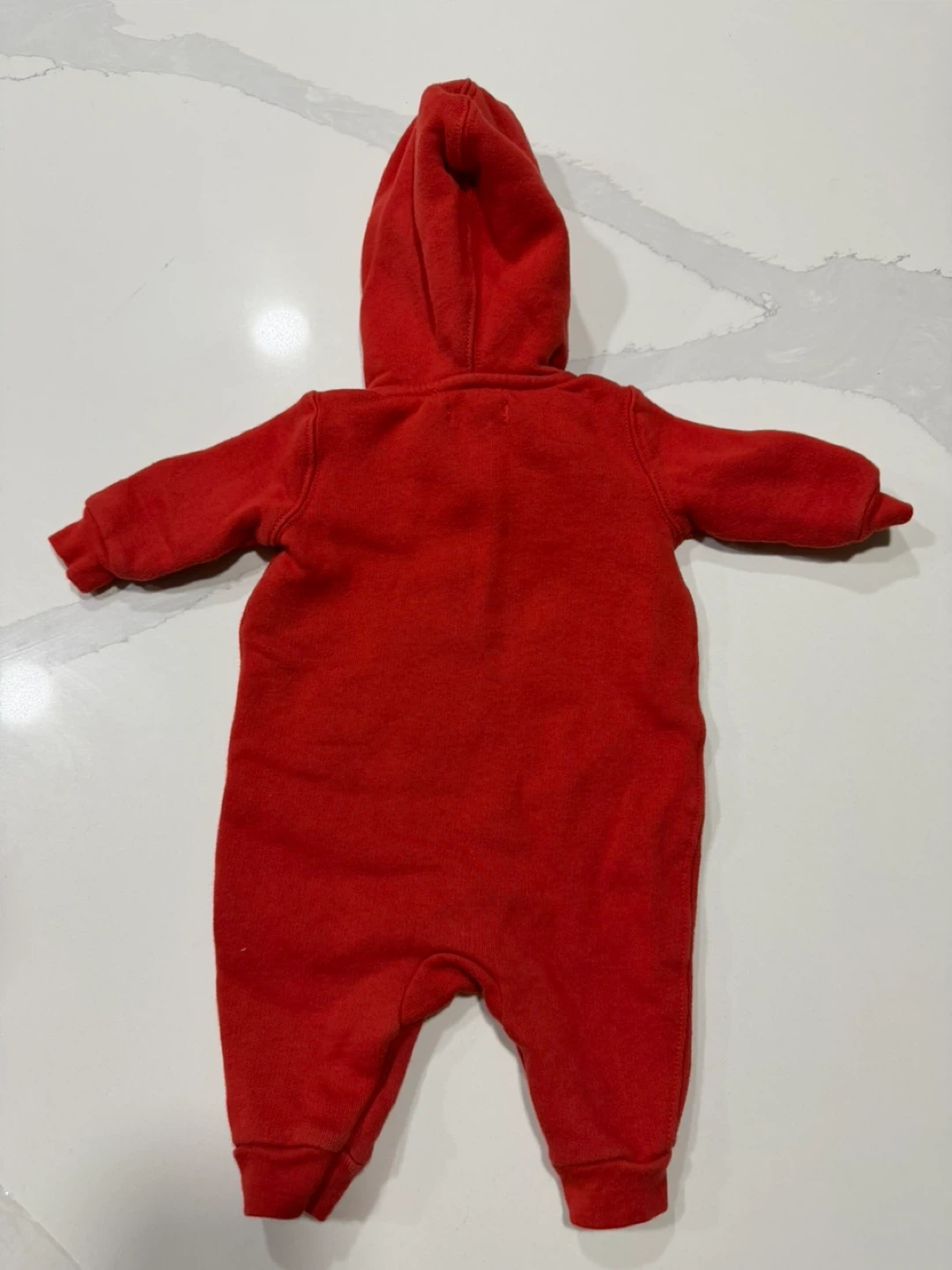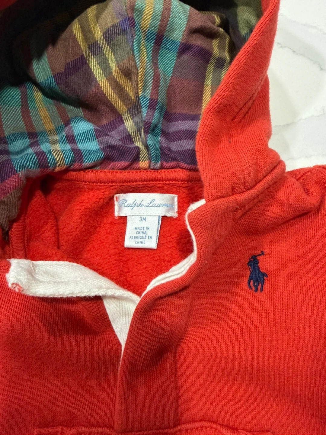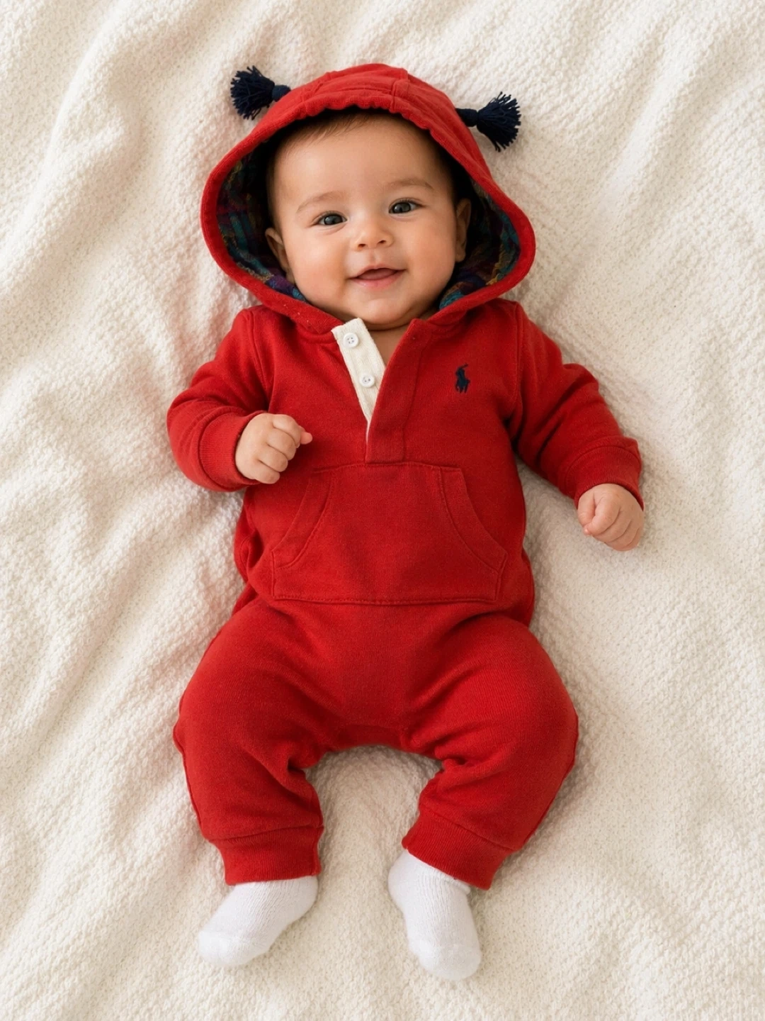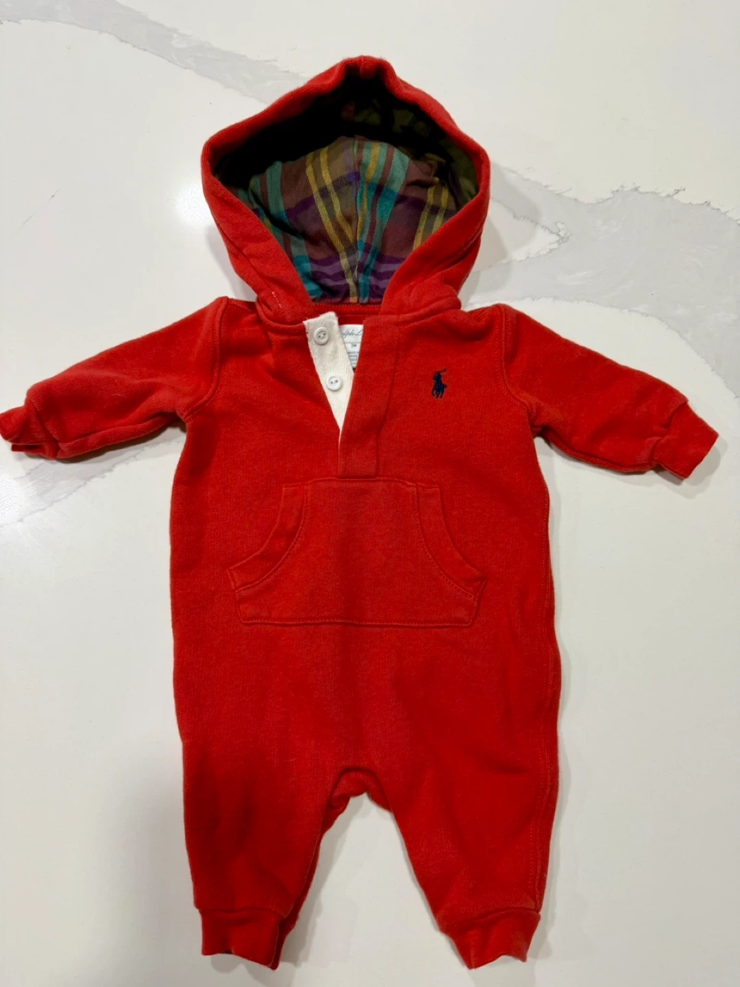 Ralph Lauren red hooded romper. Size 3M. Features a plaid lining and front pocket. Perfect for keeping your little one cozy! Snaps for quick diaper change.