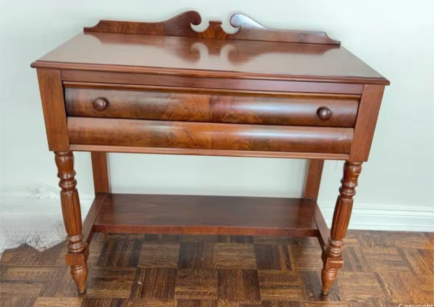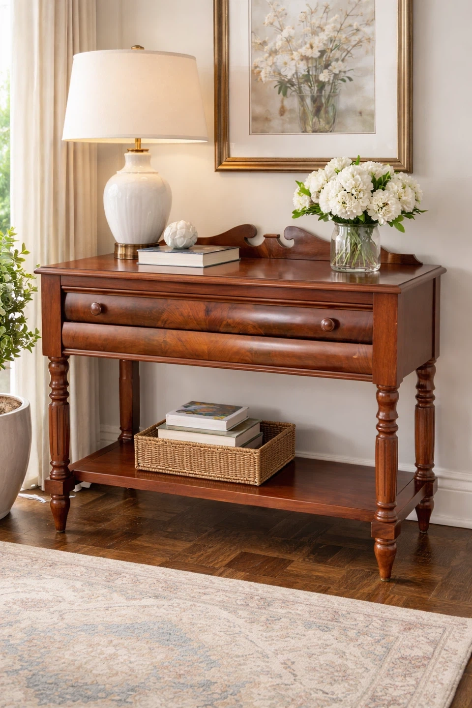 A beautiful wooden console table with a single drawer and a lower shelf. It's made of solid wood with a rich brown finish and decorative turned legs. This piece is perfect for an entryway or as an accent table.