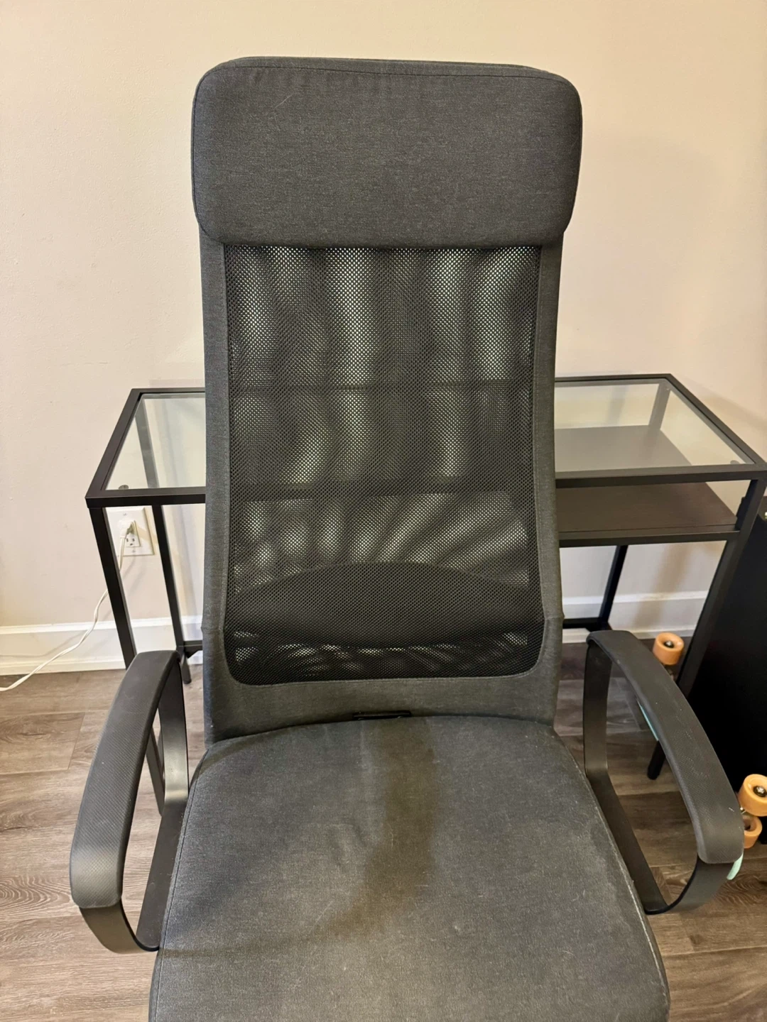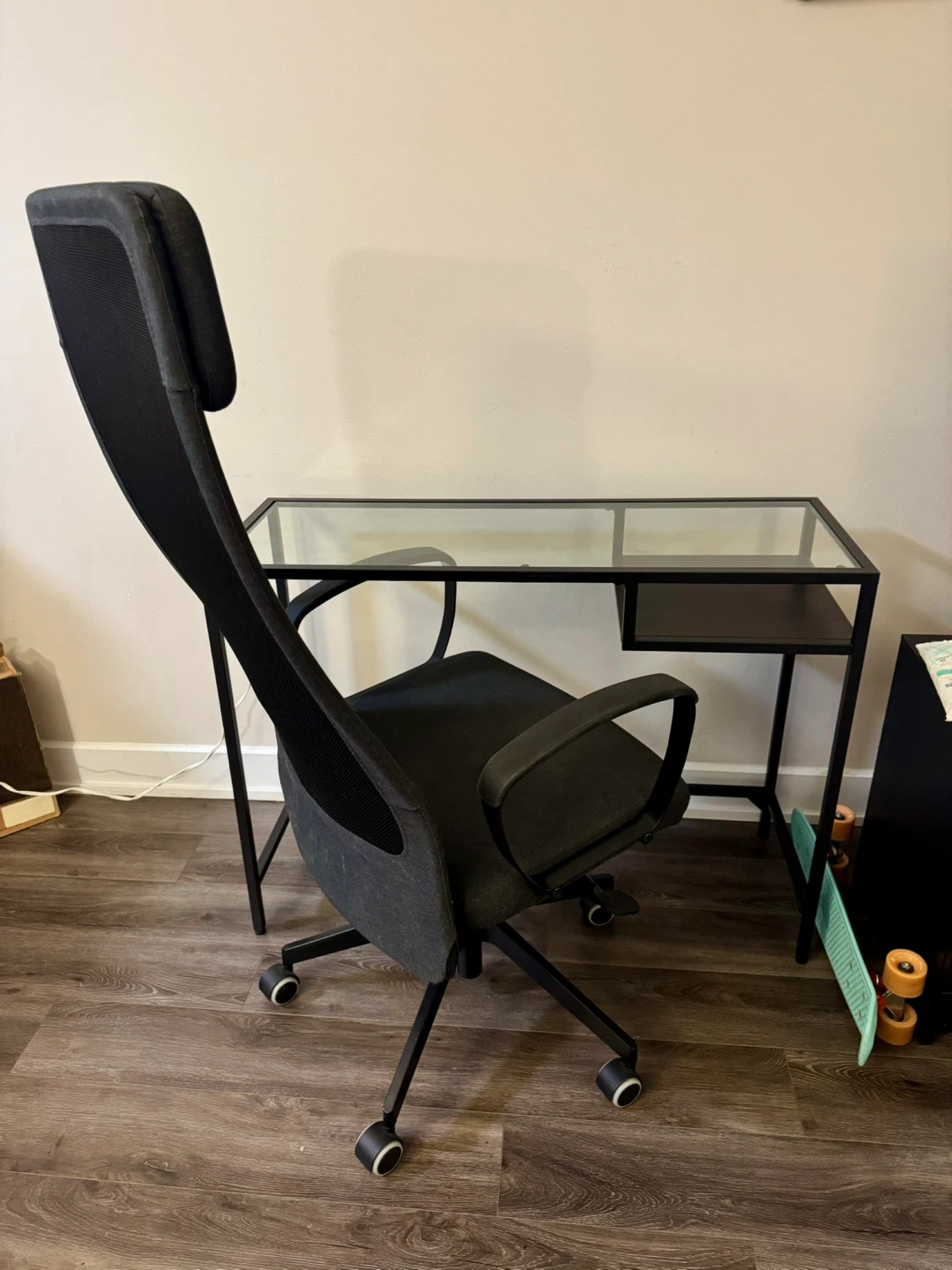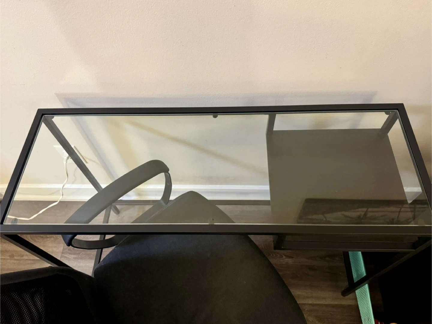 Selling a glass desk with a black metal frame. It comes with a matching office chair. It looks like new. Really great condition.