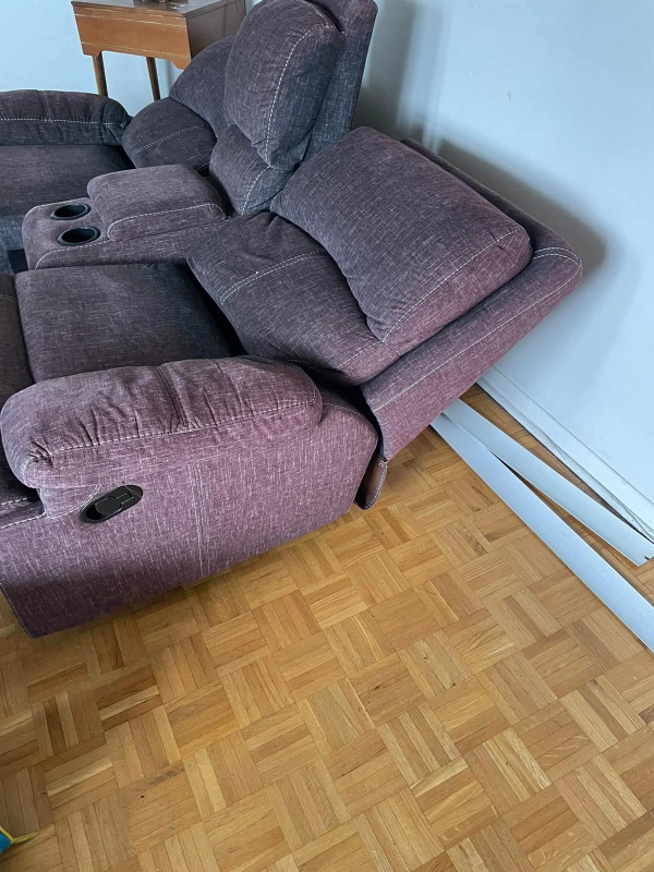 Purple fabric recliner sofa with two reclining seats. bought on carrot but no space in the house as such selling now. pickup only.