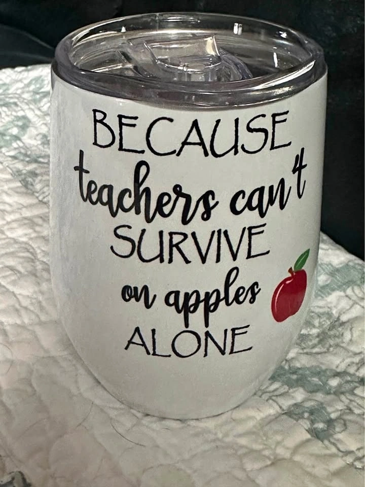 Show that special teacher in your life your appreciation with this "because teachers can’t survive on apples alone" wine tumbler. Clear top. Brand new and a great teacher gift. Pick up Welland. Please take a look at my other items posted. Thank you.