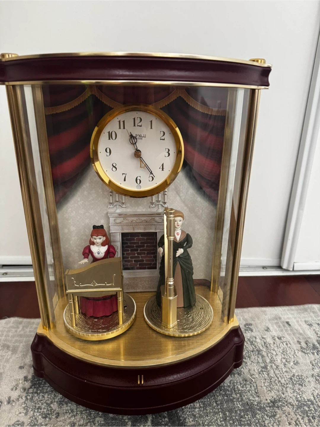 This Rhythm musical motion clock features two figurines that rotate, set within a glass case, offering a charming display. This clock is in excellent condition, having been gently used and well-maintained. It plays a selection of melodies. The clock requires batteries to operate. The clock has a rotating pendulum. All sales are final.