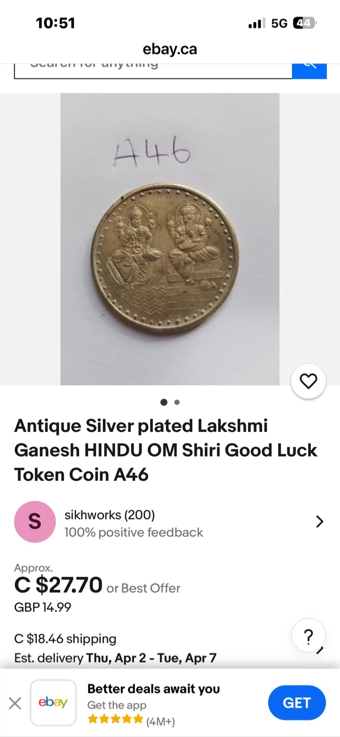 Buy & SellVintage Hindu Lakshmi Ganesha Om Good Luck Token CoinVintage Hindu Lakshmi Ganesha Om Good Luck Token Coin$20This is a gold-toned token coin featuring Lakshmi and Ganesha on one side and the Om symbol on the other. It's a good luck token.WHERE TO MEETCheck LocationView MapSELLERverifiedMustafaMarine Hamilton37036 reviews0 chats·1 favorites·7 viewsSEND CHAT TO SELLERHi Mustafa! I’m interested in your listing.Hi Mustafa! I’m interested in your listing.Get the Karrot app to chatSign In to chat
