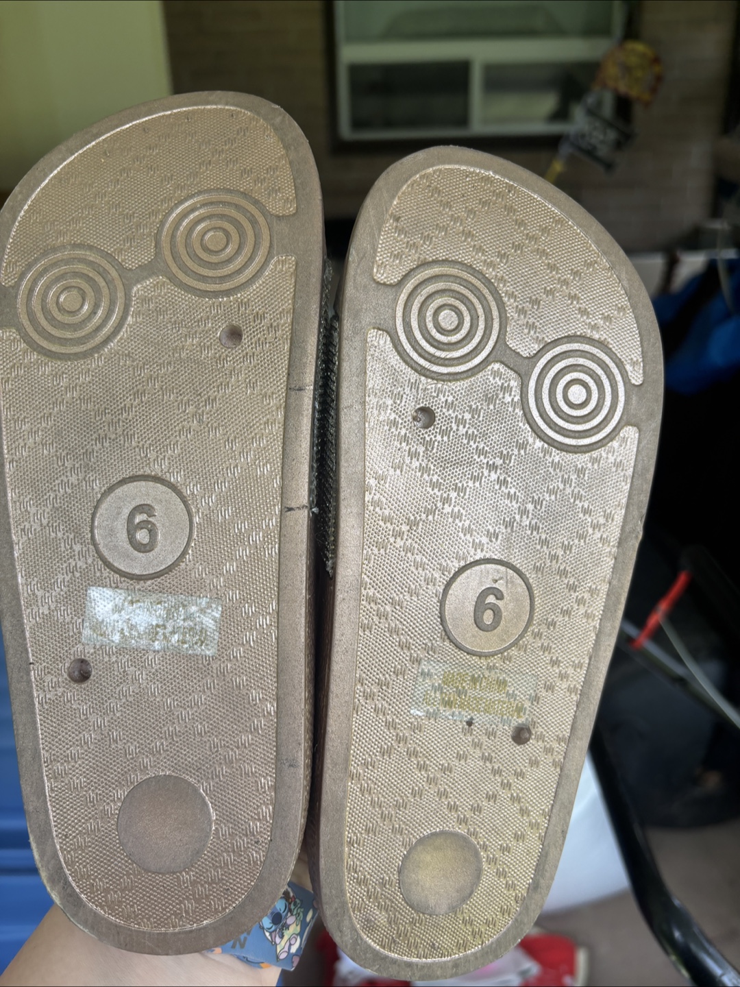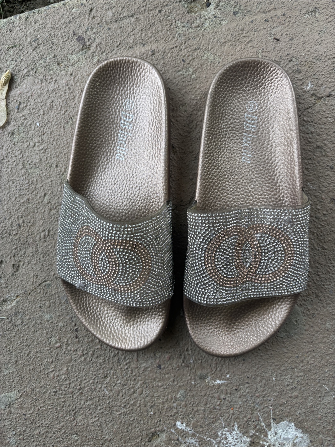 Rose gold-toned sandals, featuring a bedazzled strap. Designed as slides. They are a size 6. Slipping into these shoes can bring you a sense of peace.
