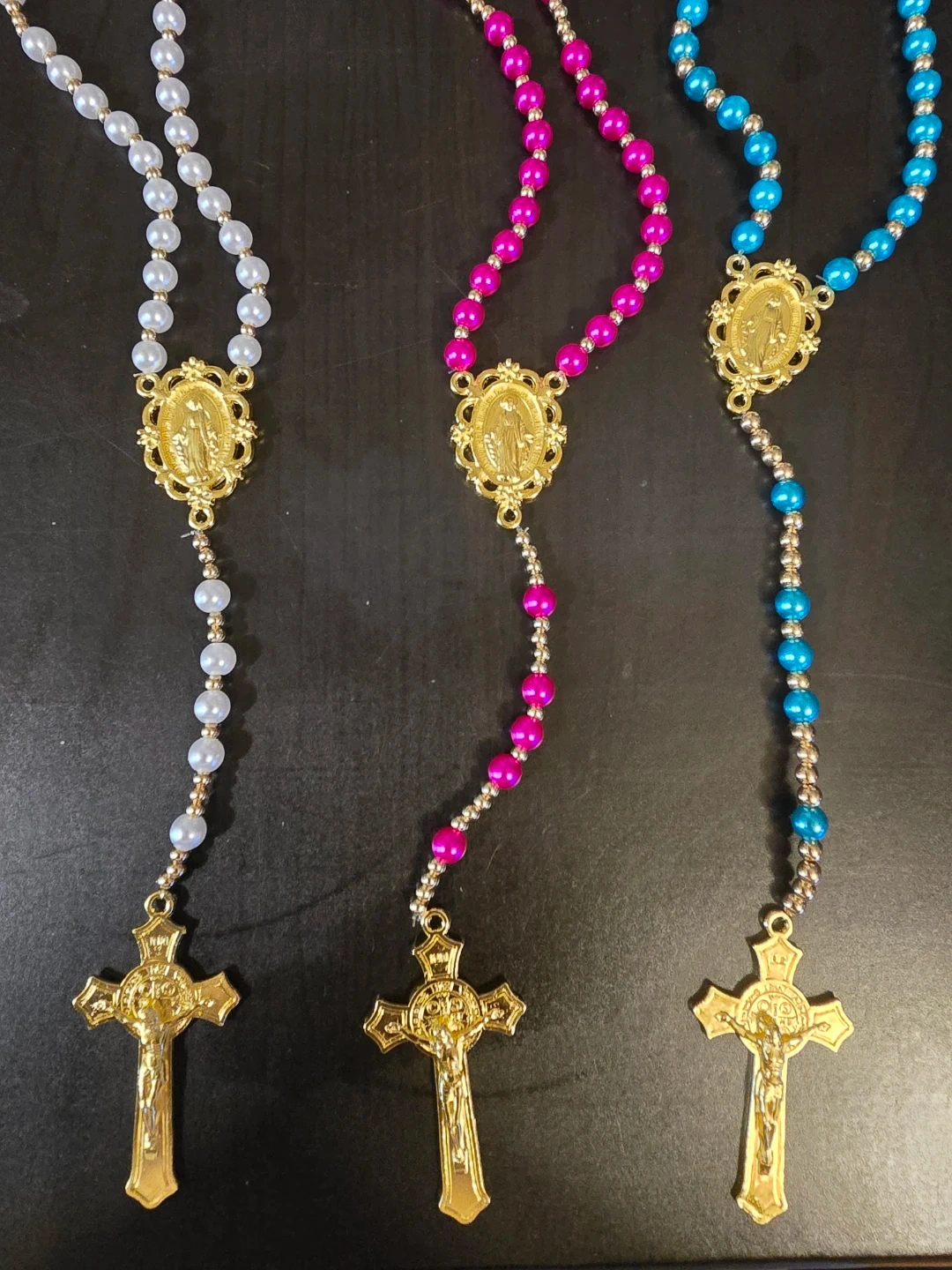 This is a rosary with faux pearl beads and a metal crucifix. It features a Miraculous Medal centerpiece. It's a classic religious item. Customize your rosary with any colors as well as choose gold or silver metal color.