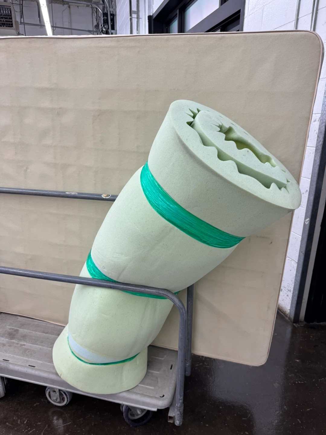 A light green foam topper, rolled and secured with bright green ties. Material is foam. Perfect for adding an extra layer of comfort to a mattress. Get this for a more restful sleep!
