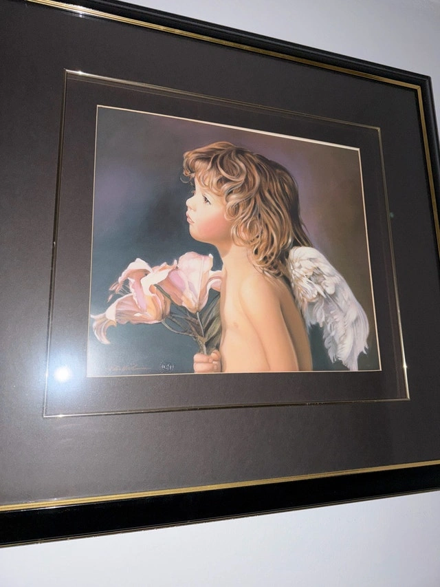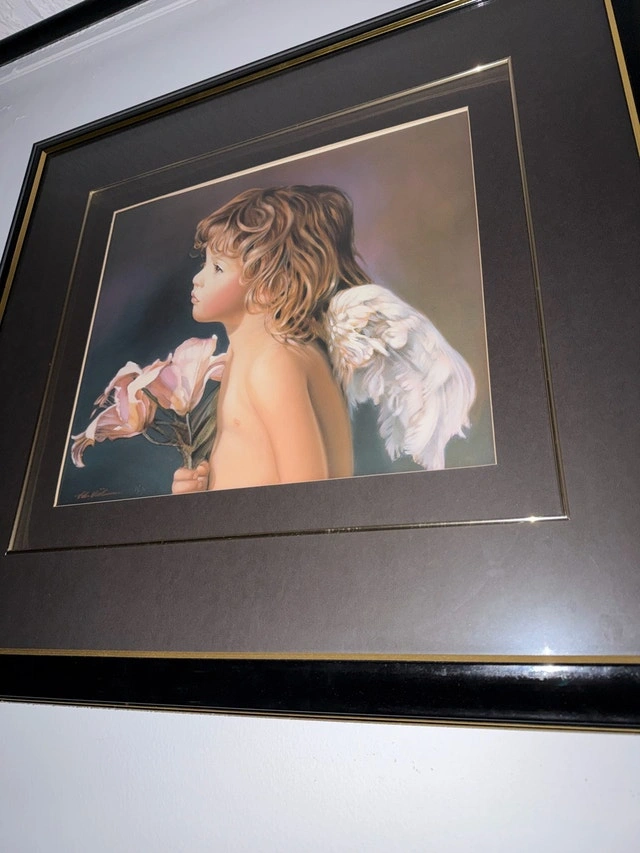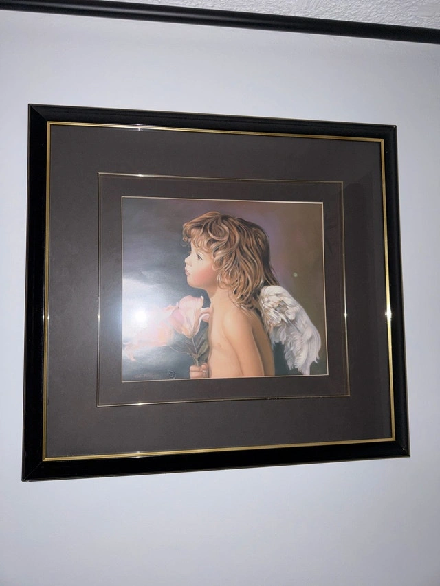Enhance your space with this framed angel print, featuring a serene child angel holding flowers. The print is in good condition and ready to hang, bringing a touch of classic elegance to any room. Dimensions are 28”w x 26”h. Ready to give this angel a new home? If you see this ad, the print is still available!
