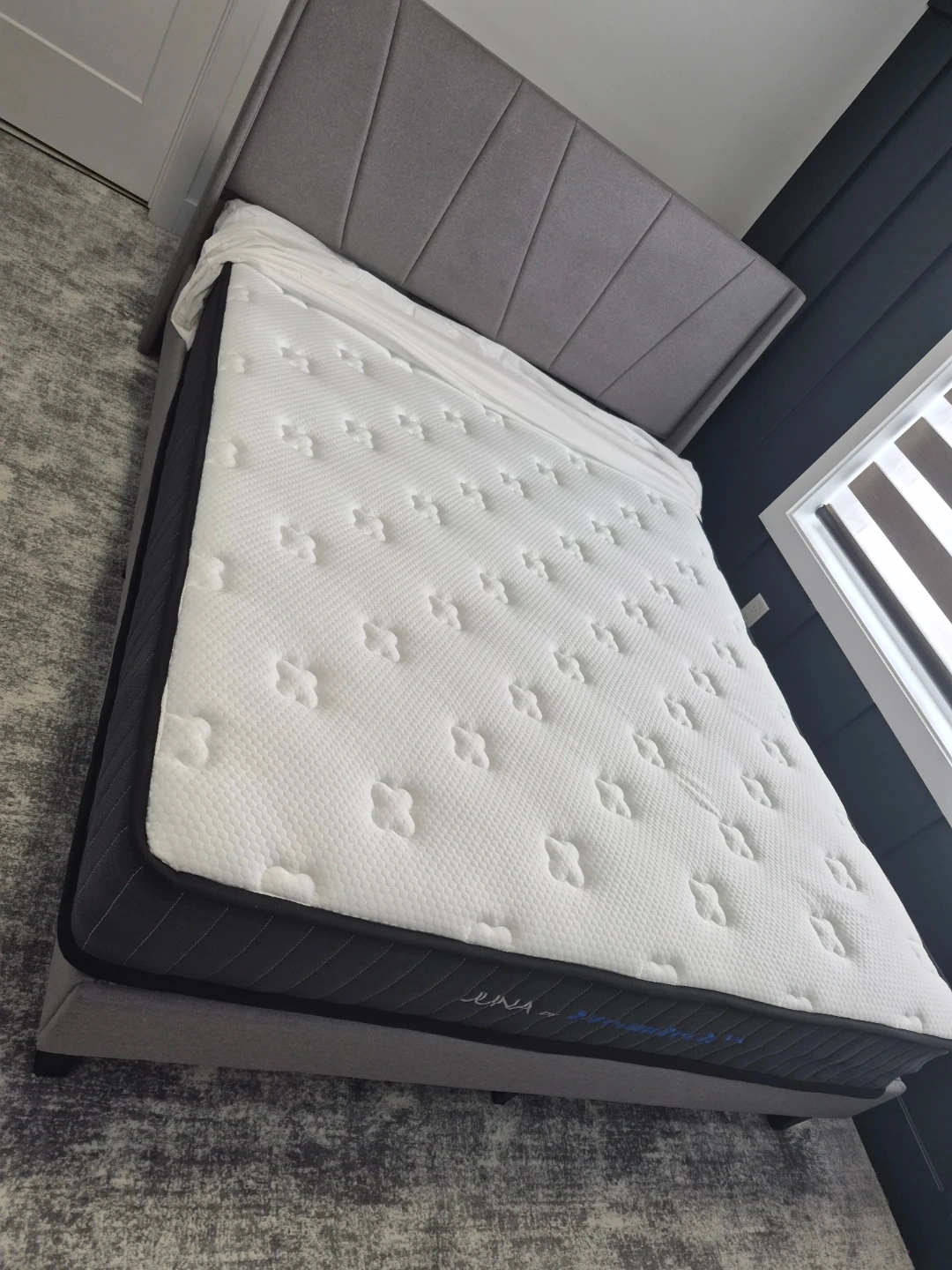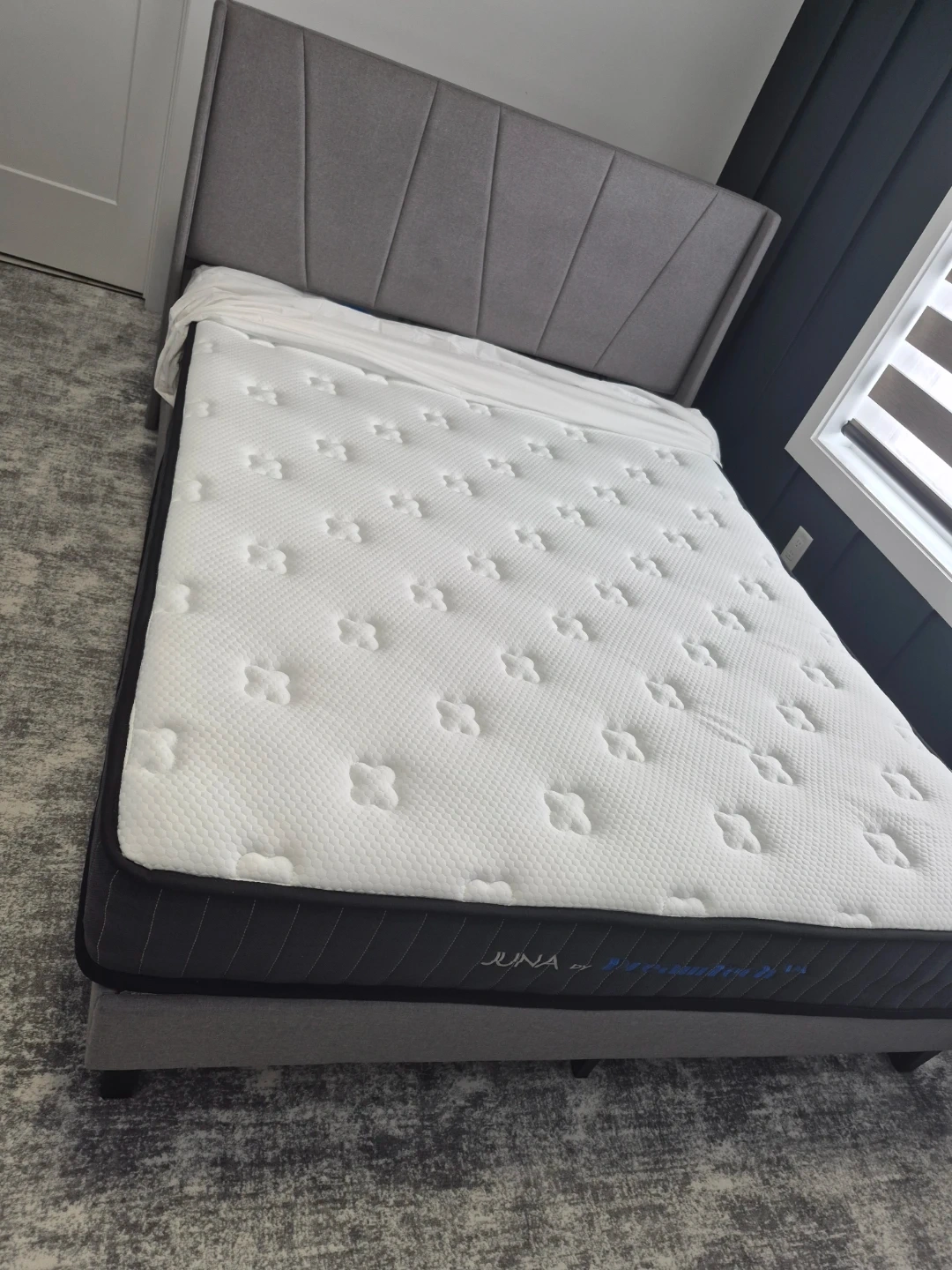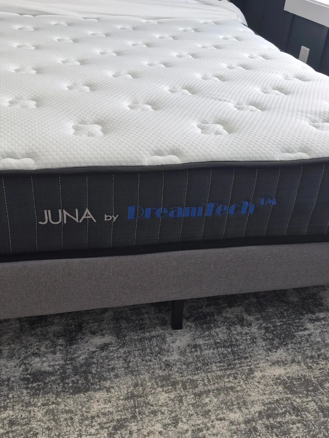 This Juna mattress by DreamTech is designed for comfort. It features a quilted top with a textured pattern and a dark grey side band. It's a great addition to any bedroom for a good night's sleep!
