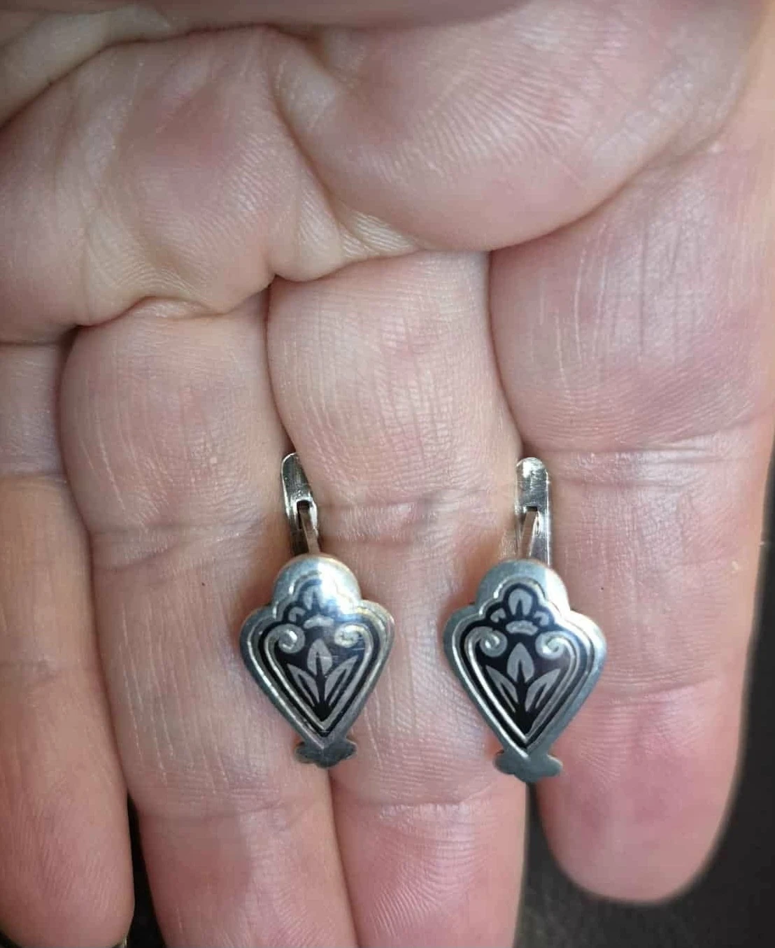 Niello silver dangle earrings with a decorative etched design. They have a hook closure. The design is intricate and classic.