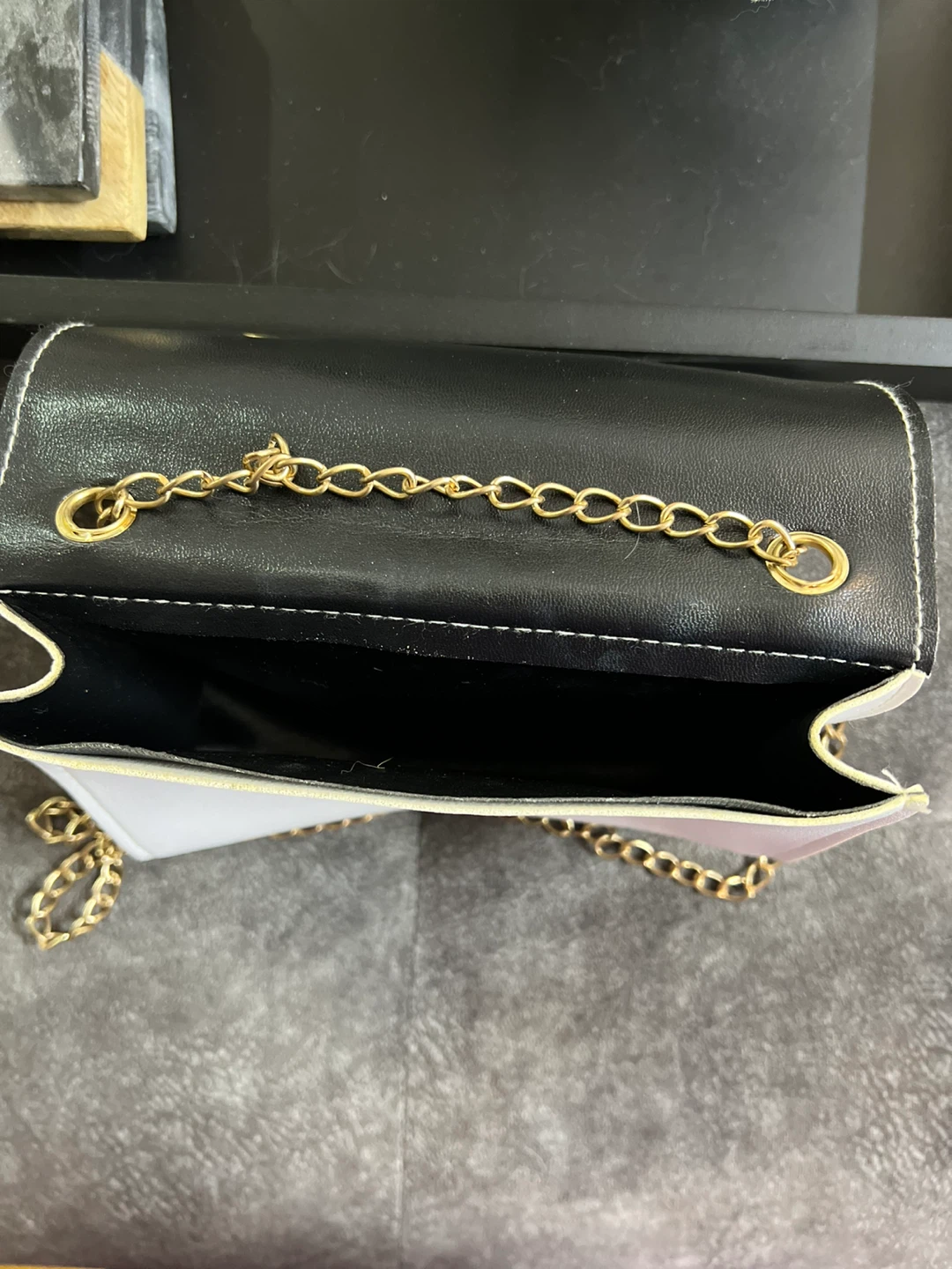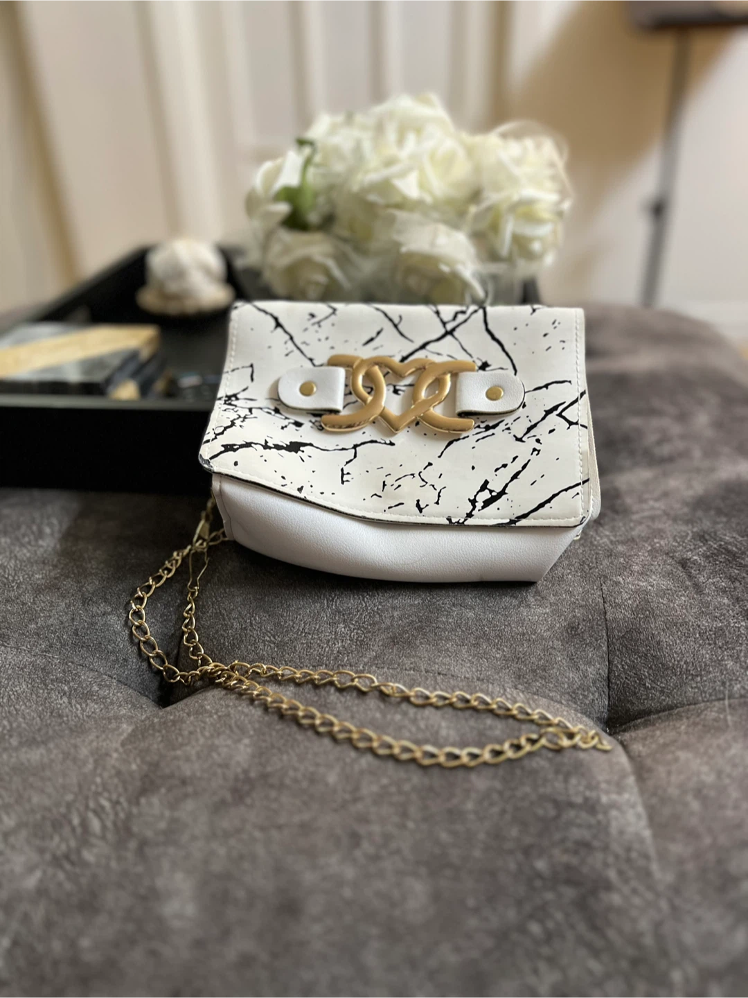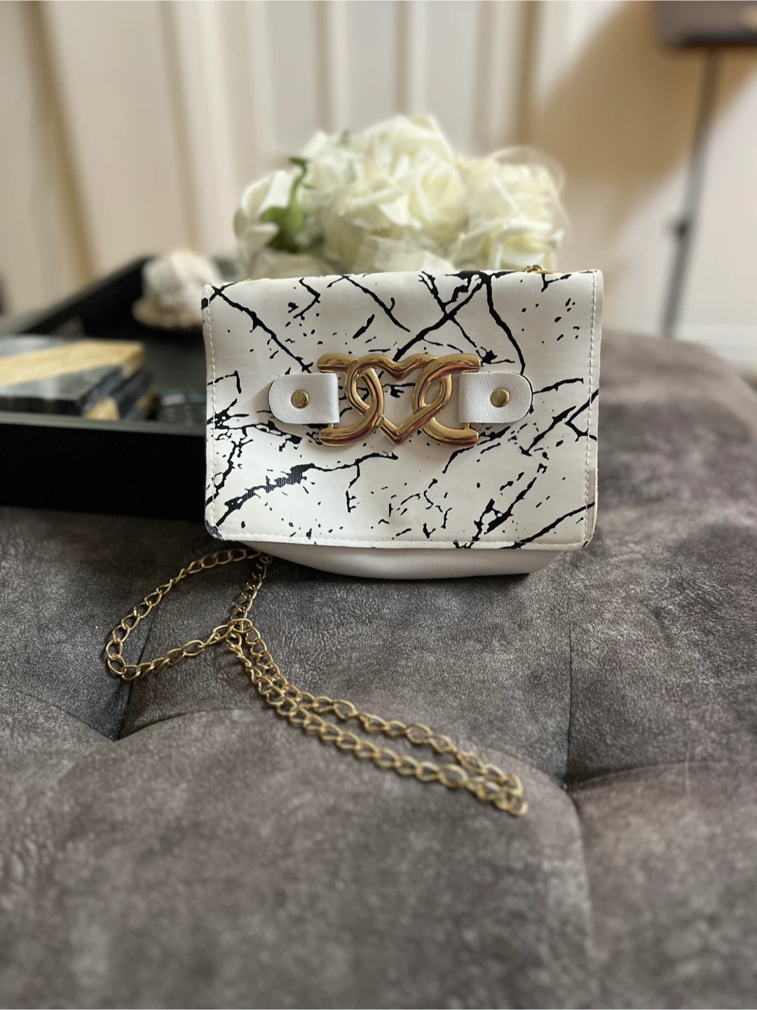 White faux leather purse with a black marble print flap and gold hardware. It's got a stylish chain strap for easy carrying. This compact bag is perfect for essentials on a night out!