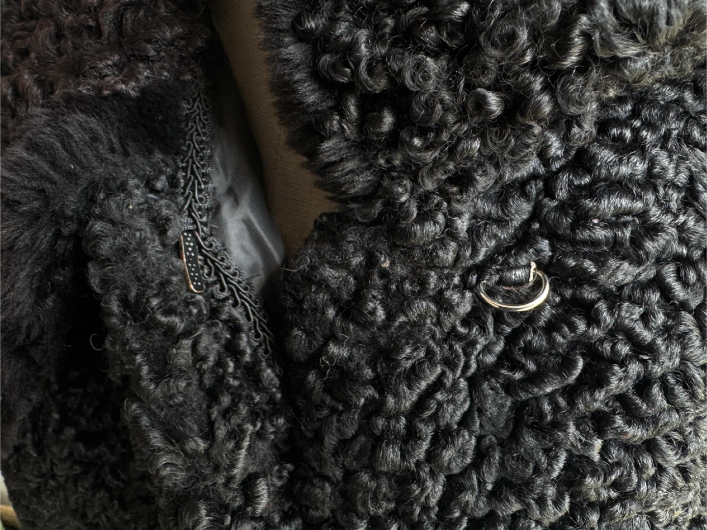 A classic black Persian lamb coat, perfect for staying warm in colder weather. It features a rich, curly texture and comes with a matching beret-style hat. This stylish set offers timeless elegance.