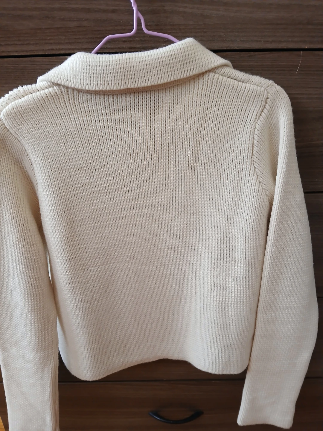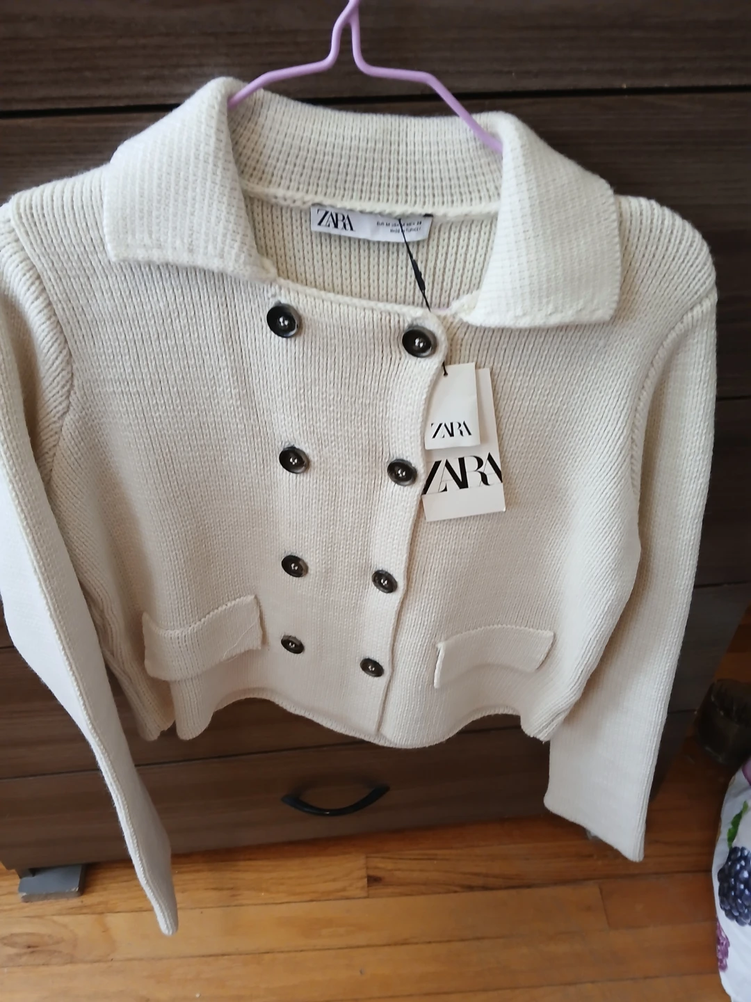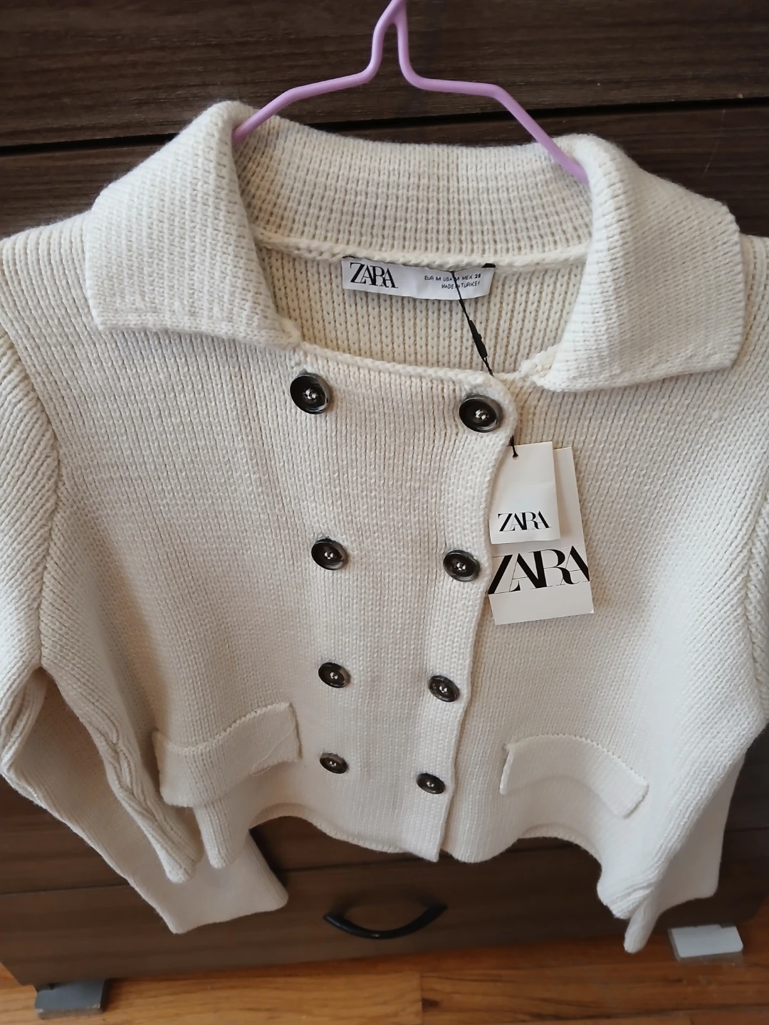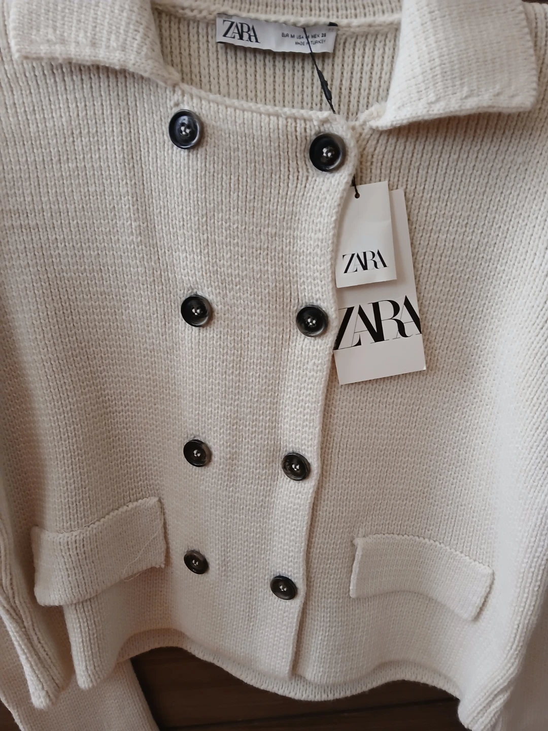 This ZARA knit cardigan is cream colored with a double-breasted button closure. It has a classic collar and two front pockets. Made from a knit material, it offers a cozy feel.