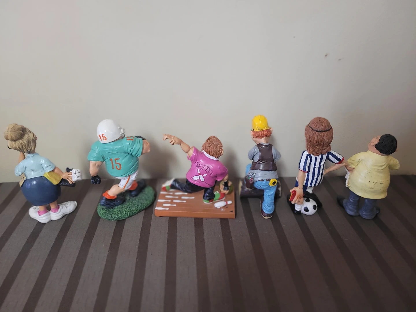 These figurines are part of The Comical World of Stratford collection, designed by artist Warren Stratford, featuring exaggerated, humorous characters in various professions and hobbies.