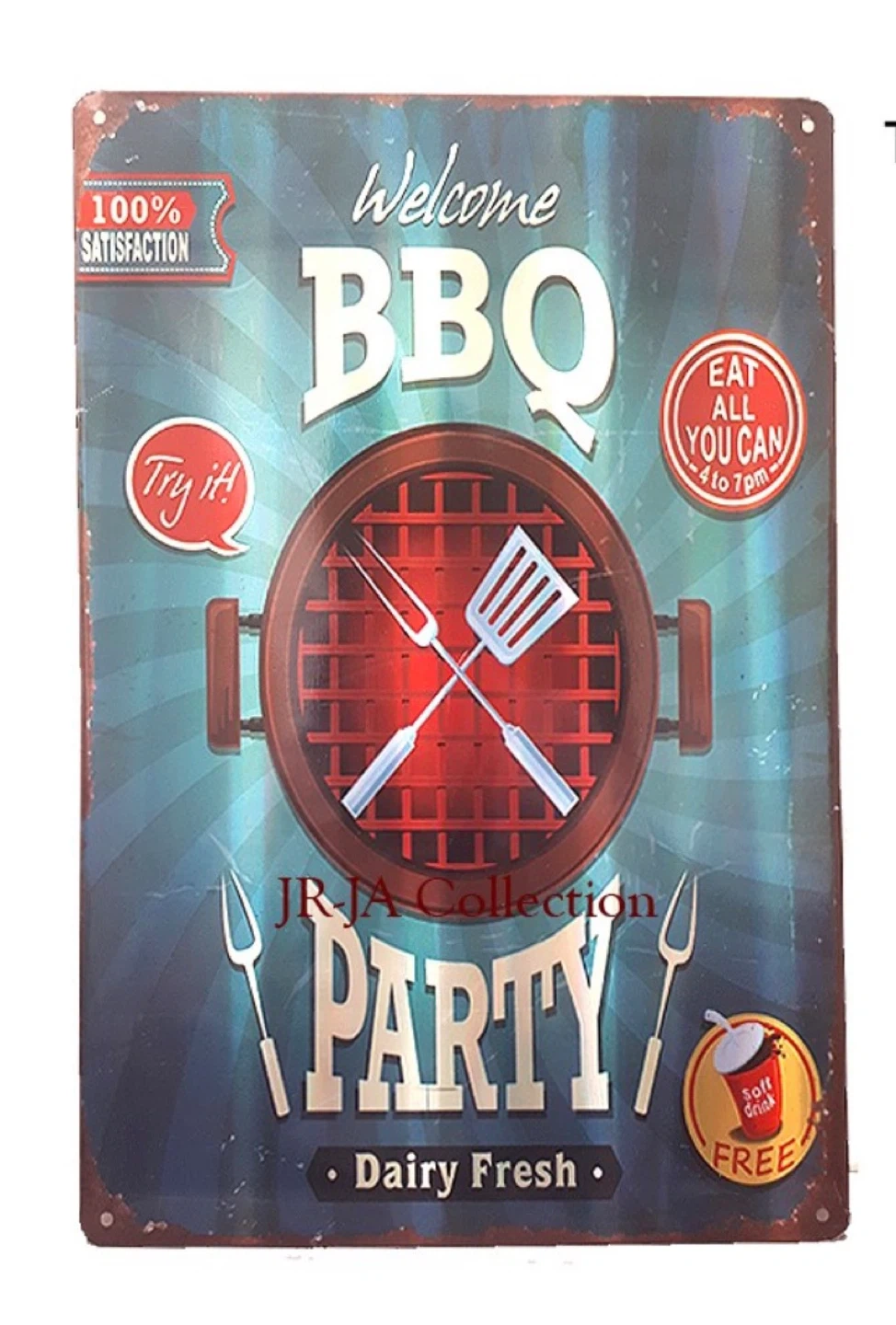 Vintage style metal sign featuring BBQ graphics and text. It reads 'Welcome BBQ Party' with 'Eat All You Can 4 to 7pm'. 'Dairy Fresh' is also noted. This sign is great for a kitchen or patio decor!