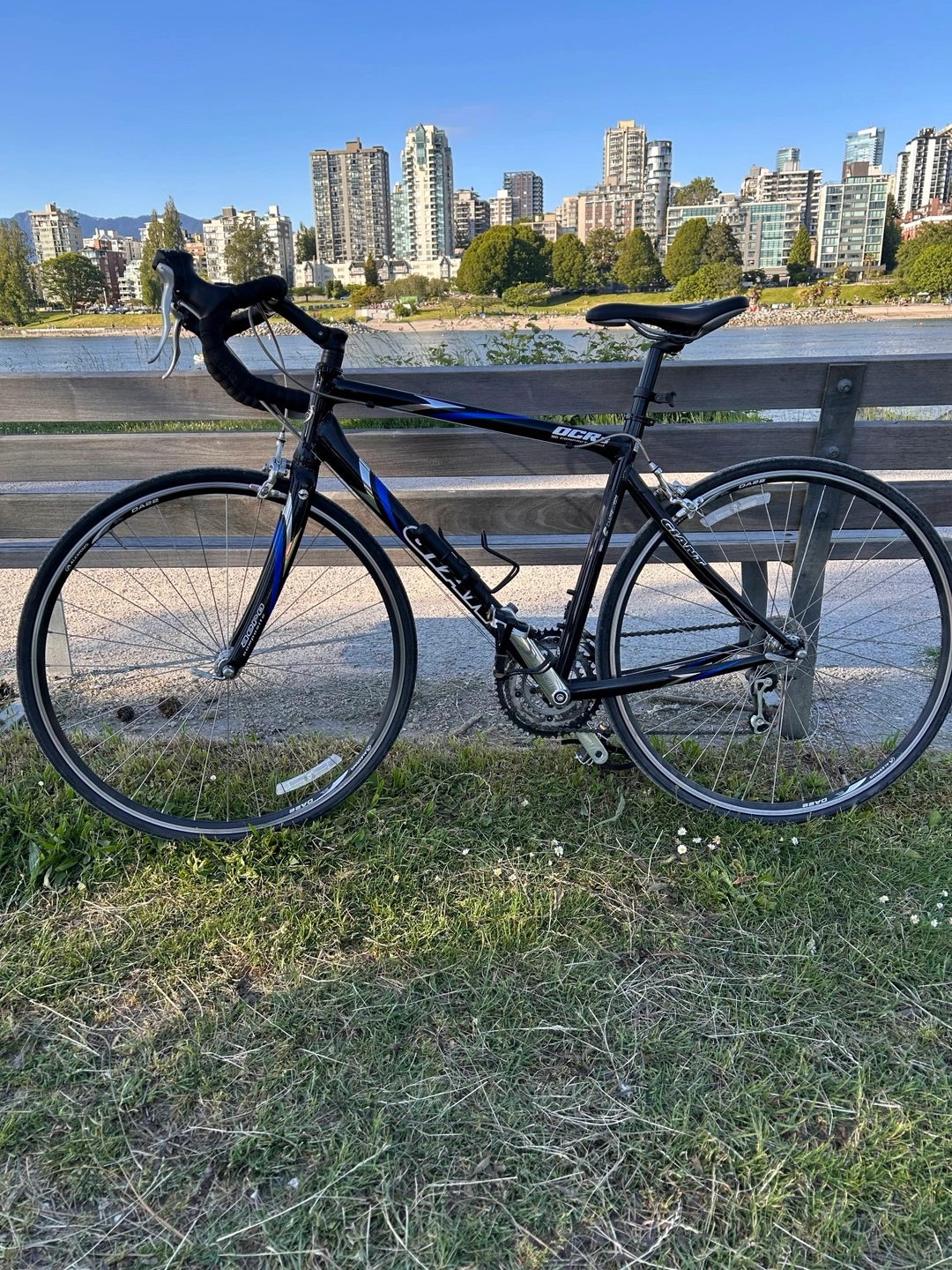 Pre-owned Giant OCR3 road bike. Black frame with blue accents.