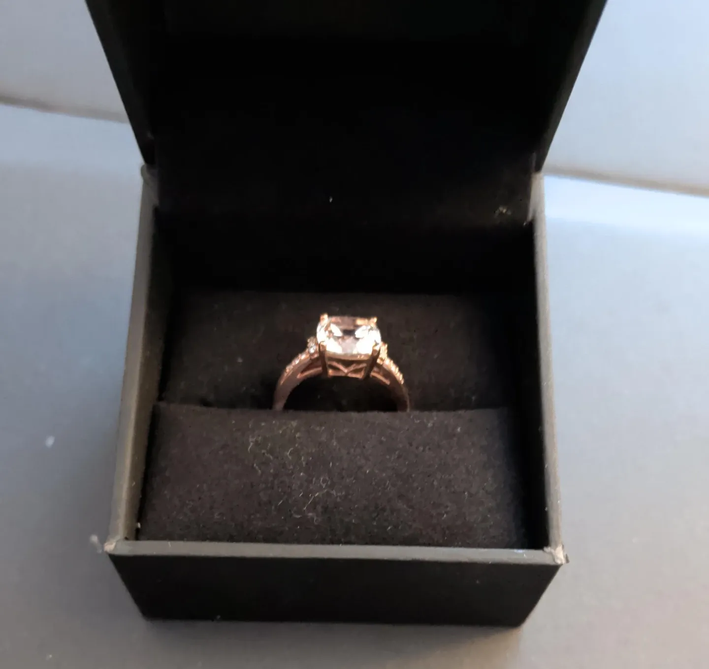 A beautiful rose gold ring featuring a princess cut centre stone and accent stones along the band. It's set in a classic solitaire setting with a pavé band. Comes in a black velvet ring box. Size 7.5
