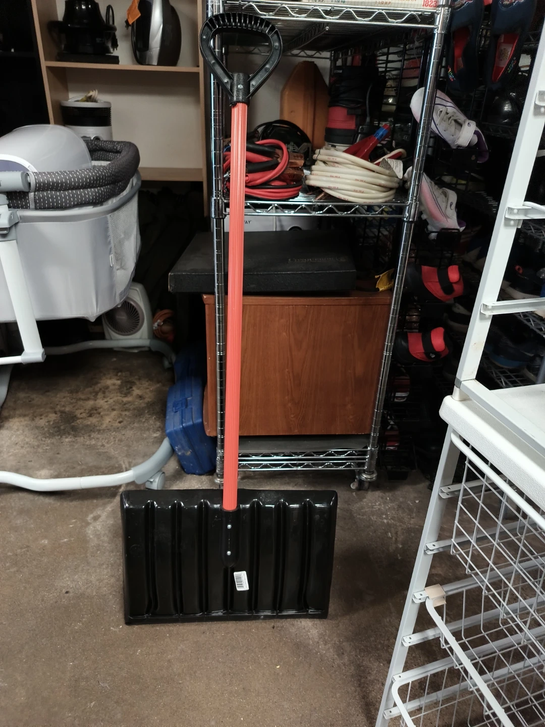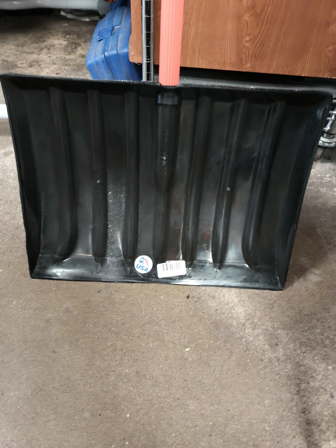 This is a durable black snow shovel with a bright orange handle. It's designed for efficient snow removal. Constructed with sturdy materials for reliable use during winter weather.