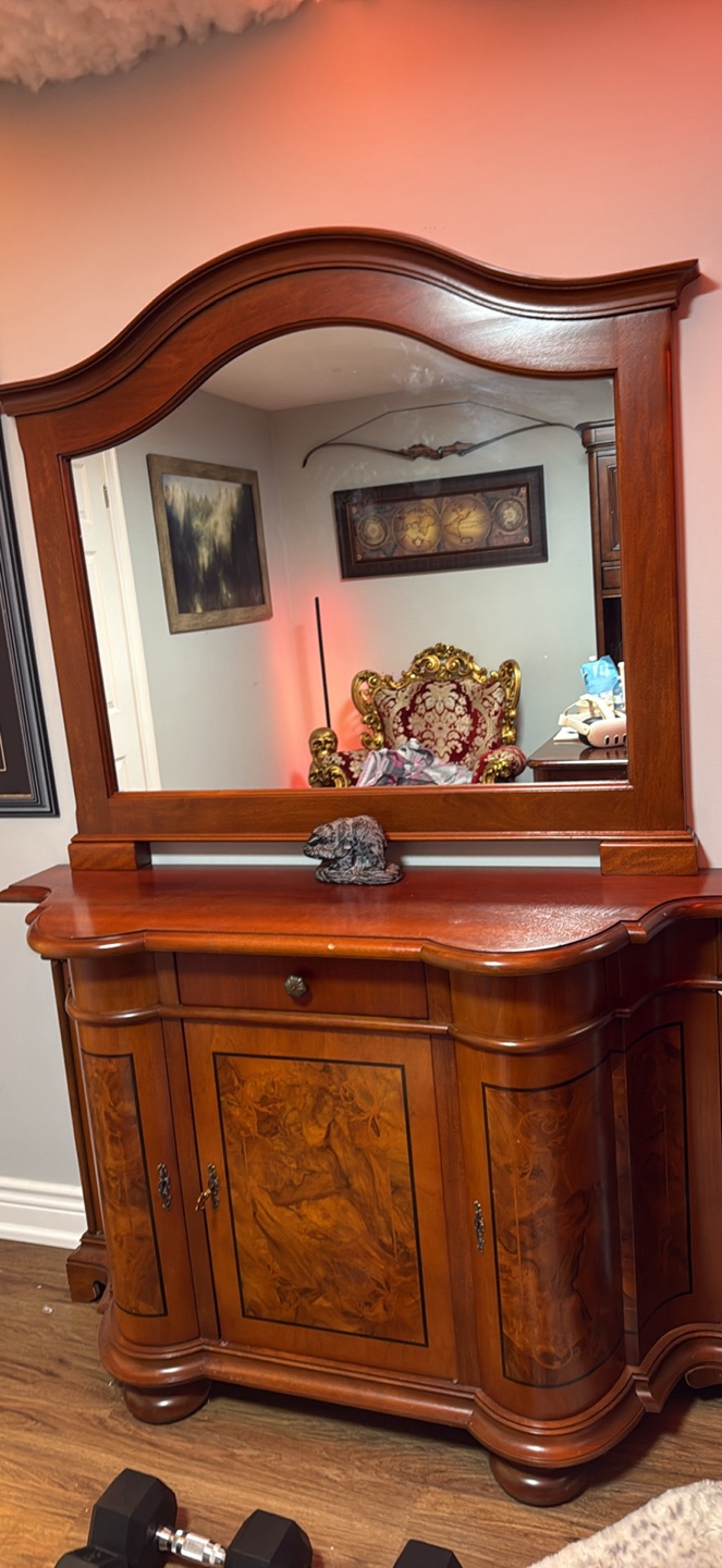 Selling a beautiful antique wood buffet with a mirror. It features a rich, dark wood finish and ornate detailing. It would be a great addition to any dining room or living space!