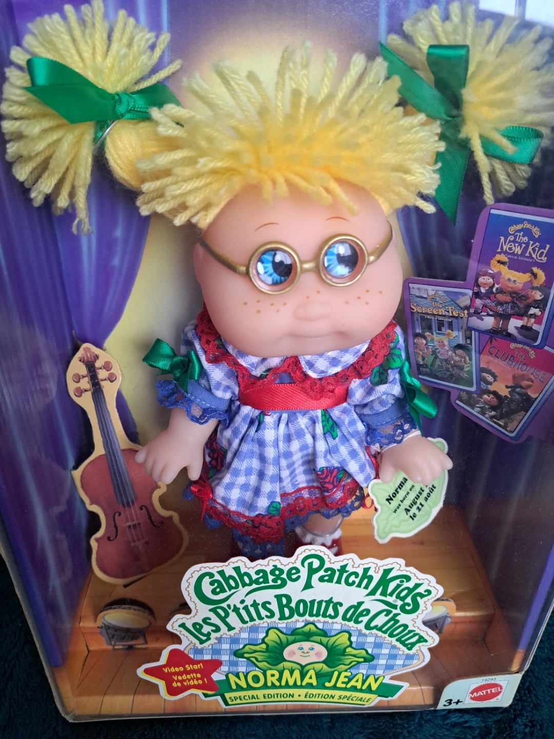 Selling a Cabbage Patch Kids doll, Norma Jean Special Edition! This adorable doll comes in its original box and is ready for a new home with a collector or a child. The box has a Mattel logo and indicates it is suitable for ages 3+