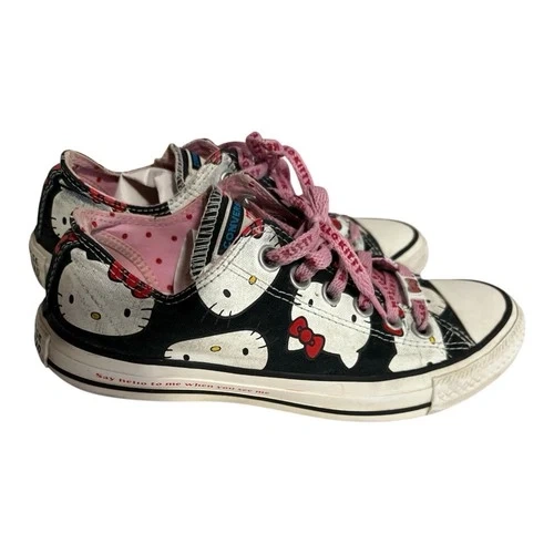 These are the limited-edition Converse x Hello Kitty Chuck Taylor All Star Canvas Ox sneakers, released in August 2018. They feature a black canvas upper with an all-over Hello Kitty face print and pink laces. Colorway: Black/Prism Pink/White. Features include the Hello Kitty pattern across the canvas upper, "Say hello to me when you see me!" messaging on the midsole, and lace dubraes shaped like Hello Kitty's bow. The inner lining has a pink and red polka-dot print. Preowned condition with some fading on the Hello Kitty print. Soles and interior are still in great condition with a lot of life left.