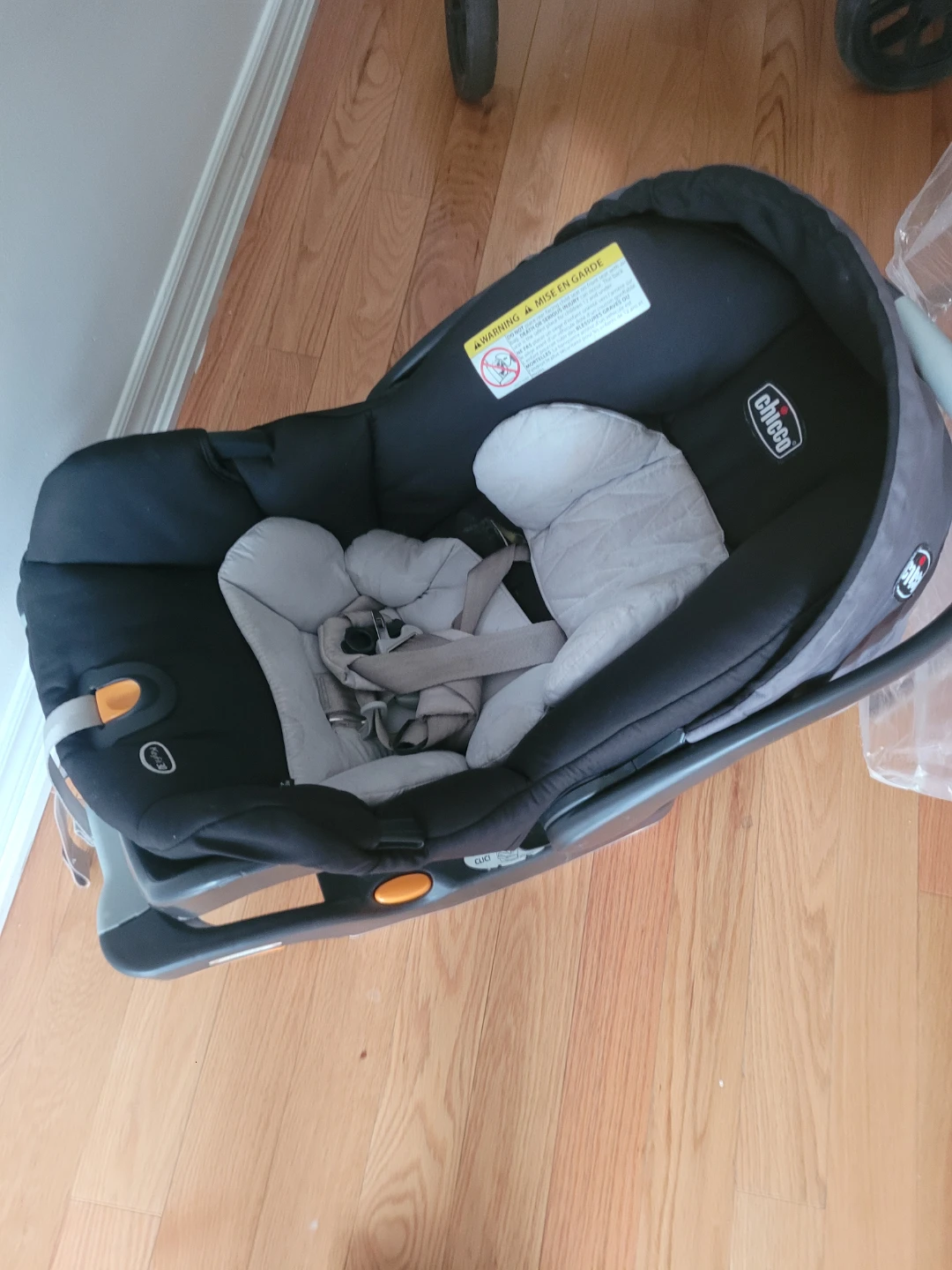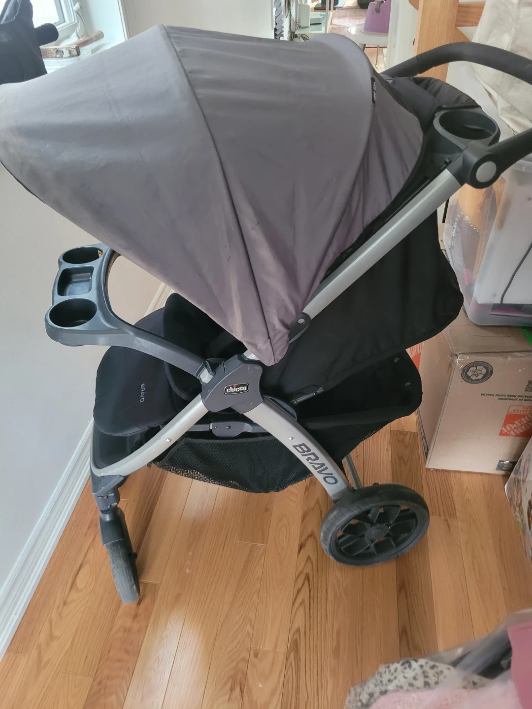 This is a Chicco Bravo stroller and KeyFit 30 infant car seat combo. The stroller features a grey canopy and black fabric. The car seat is black with grey infant inserts and harness. Both are in good used condition just some scratches and a little sun burn on the roof