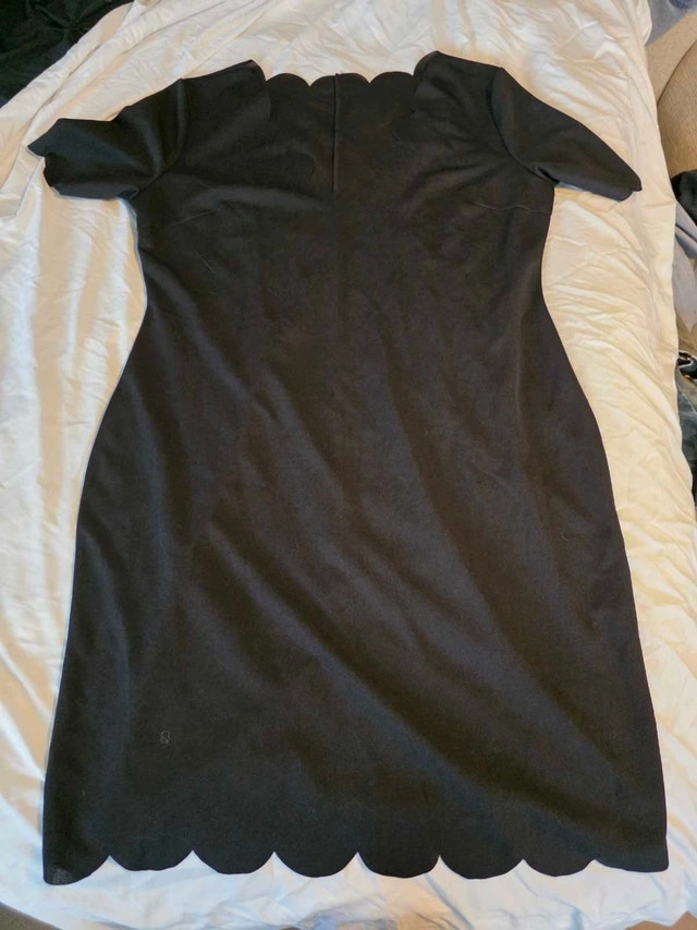 A "Little Black Dress" with a modern twist! This classic black shift dress features beautiful scalloped detailing along the neckline and the bottom hem. The short sleeves and structured fit make it versatile enough for the office, a funeral, or a cocktail party. Size: XXL. Condition: Great condition. Style: Classic / Professional / Mod. Key Features: Scalloped neckline and hem, short sleeves, back zipper closure.