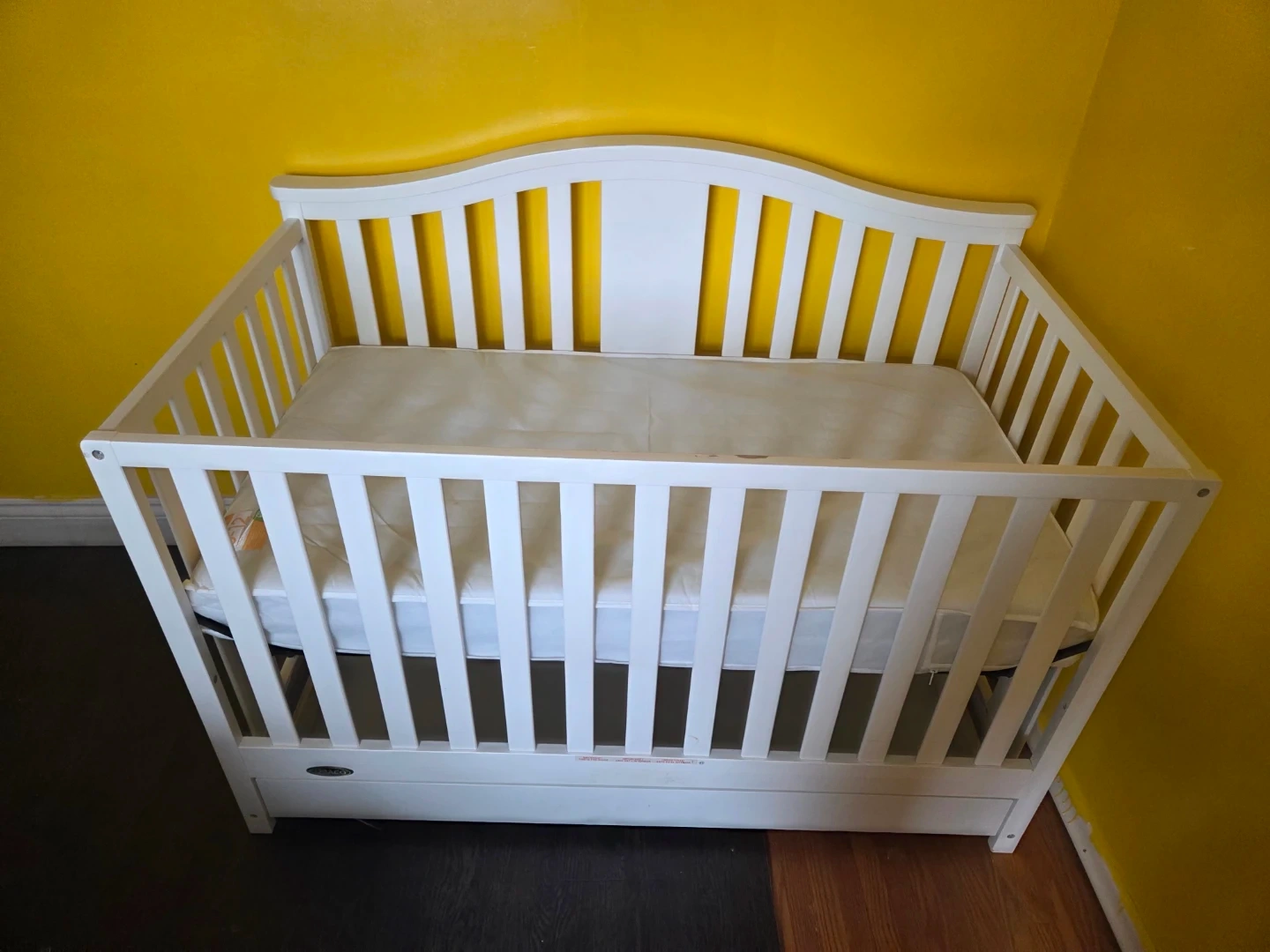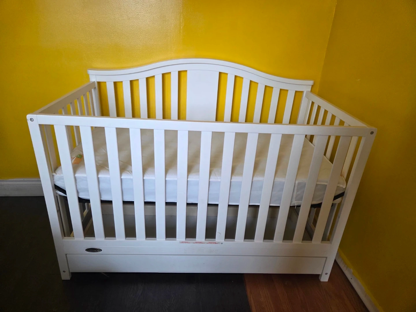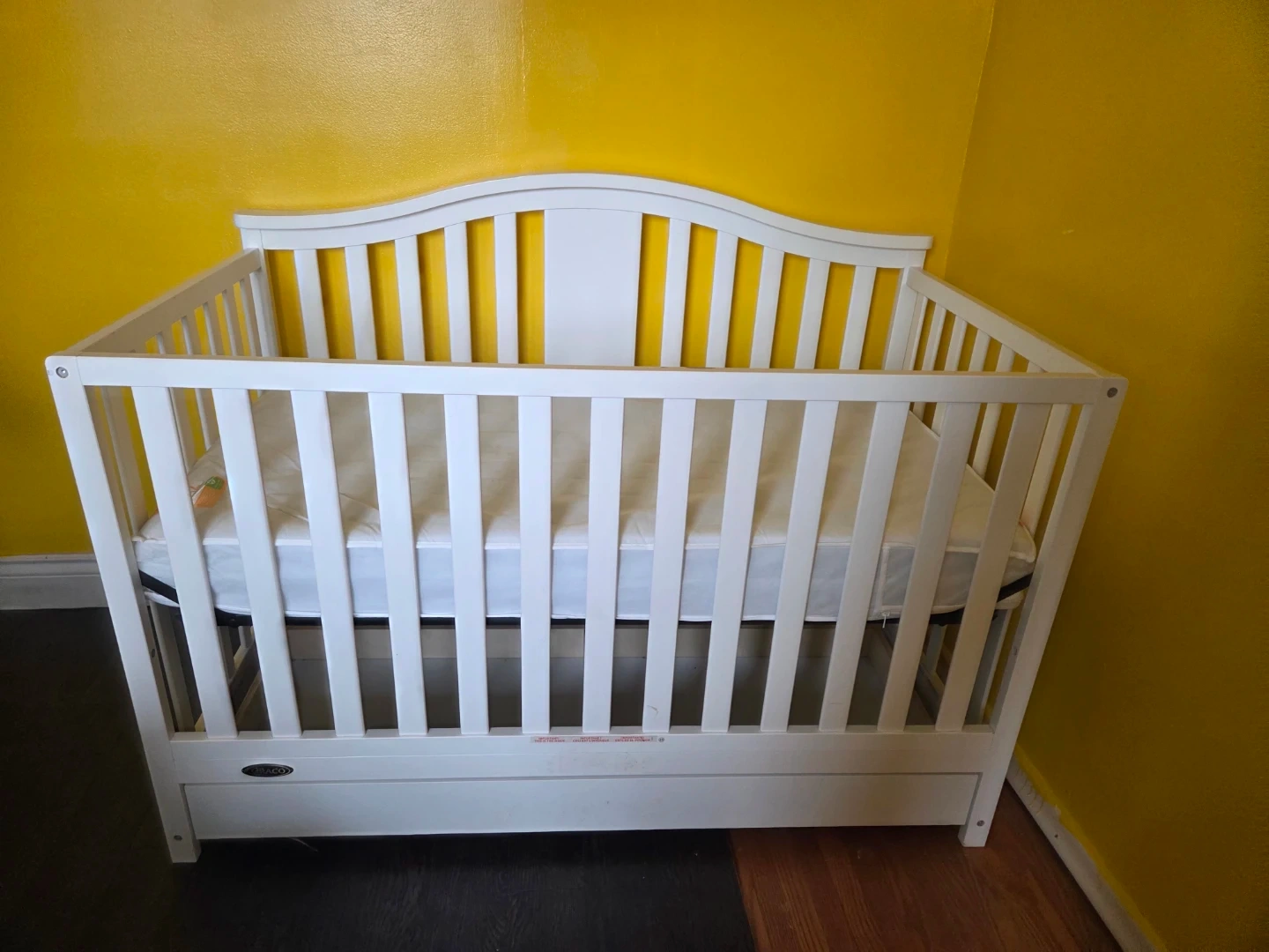 White Graco crib including mattress. It's made of wood and features a drawer for storage underneath. Cribs are essential for infant safety and sleep.