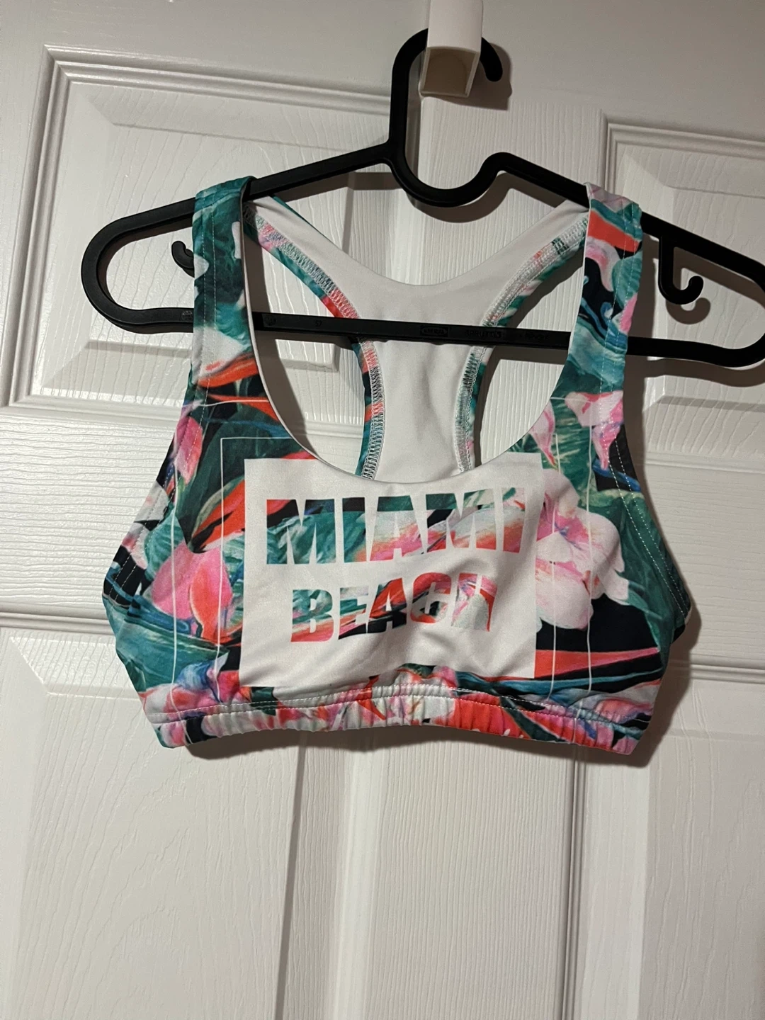 Selling a mixed lot of clothing items. The lot includes a sports bra with a Miami Beach design, a long-sleeved Old Navy top, and several other tops in various styles and colours