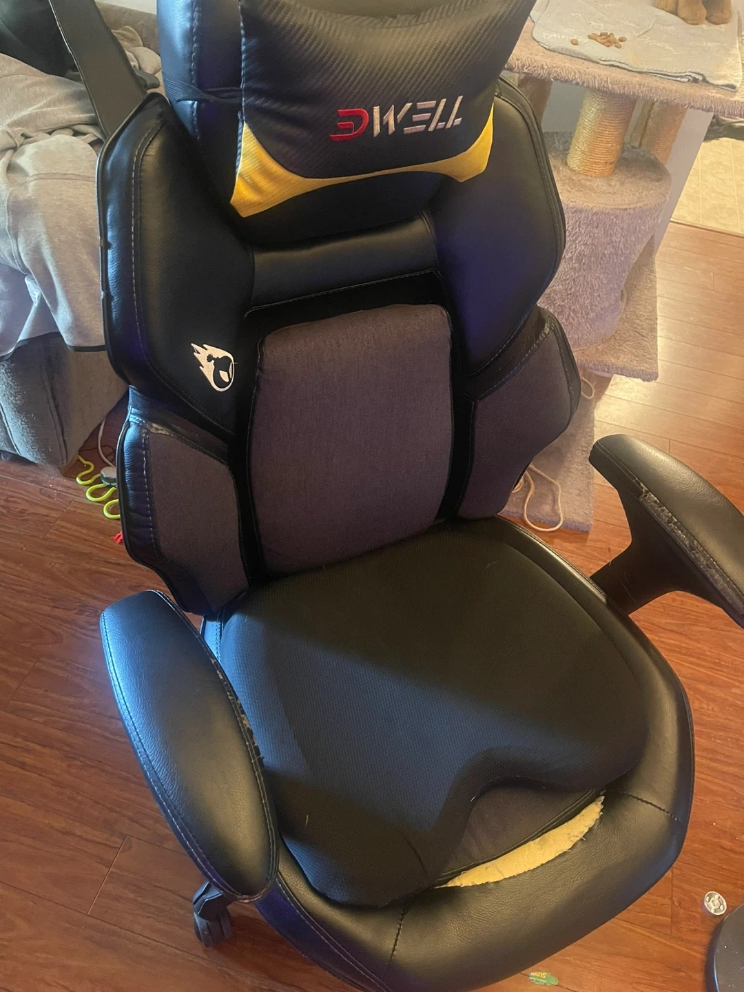 This Dwell gaming chair is designed for comfort and support during long gaming sessions. It features adjustable armrests and a lumbar support cushion. The seat has some wear and tear, as shown in the photos.