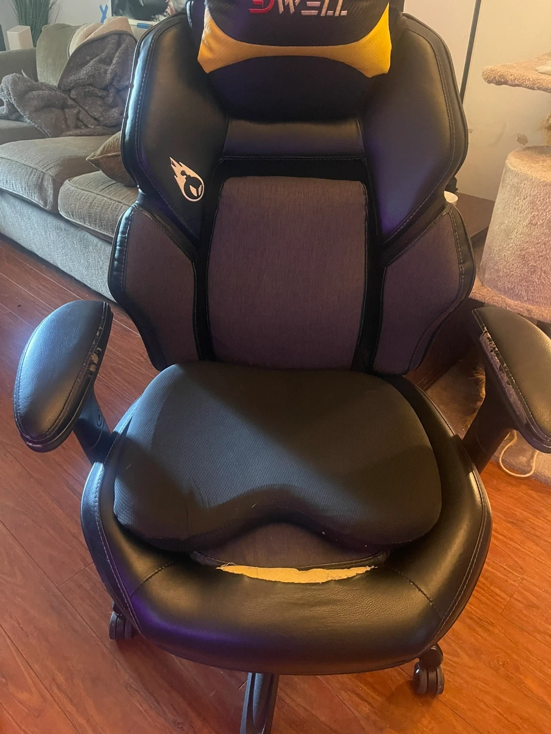 This Dwell gaming chair is designed for comfort and support during long gaming sessions. It features adjustable armrests and a lumbar support cushion. The seat has some wear and tear, as shown in the photos.