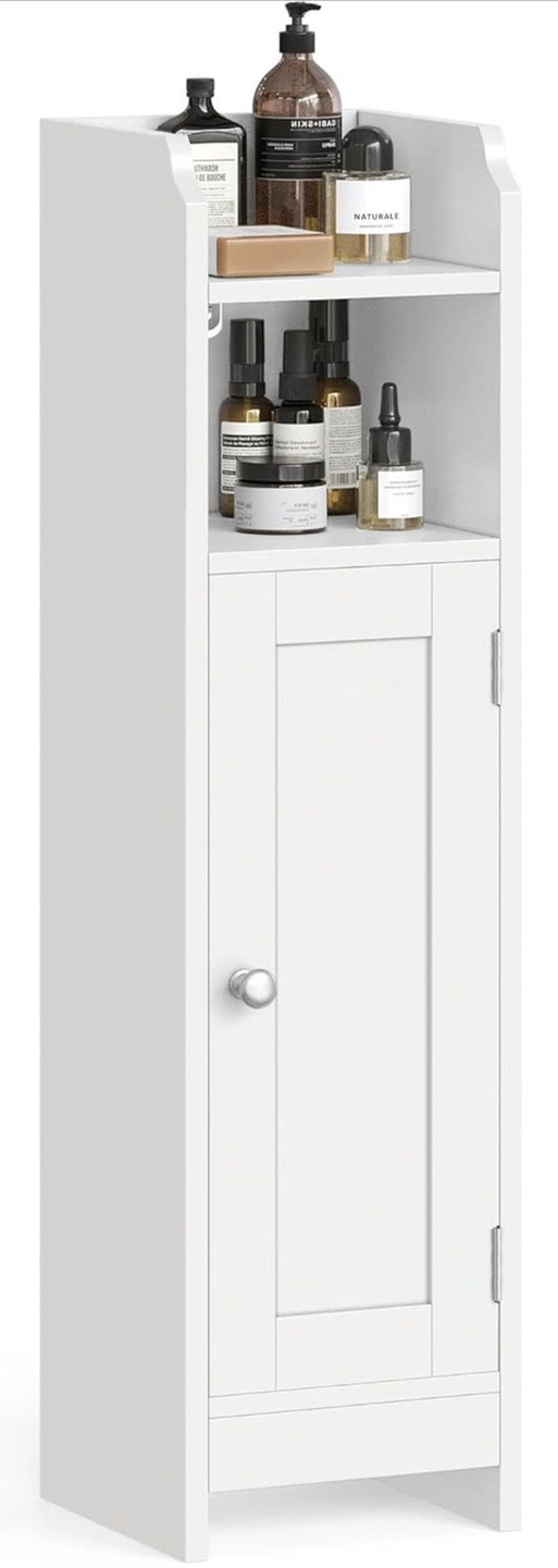 This new VASAGLE corner floor cabinet offers a stylish storage solution for your bathroom, living room, or hallway. Featuring a sleek white finish, it includes both a cabinet with a door and two open compartments for versatile storage options. Its slim design makes it perfect for maximizing space in any room.