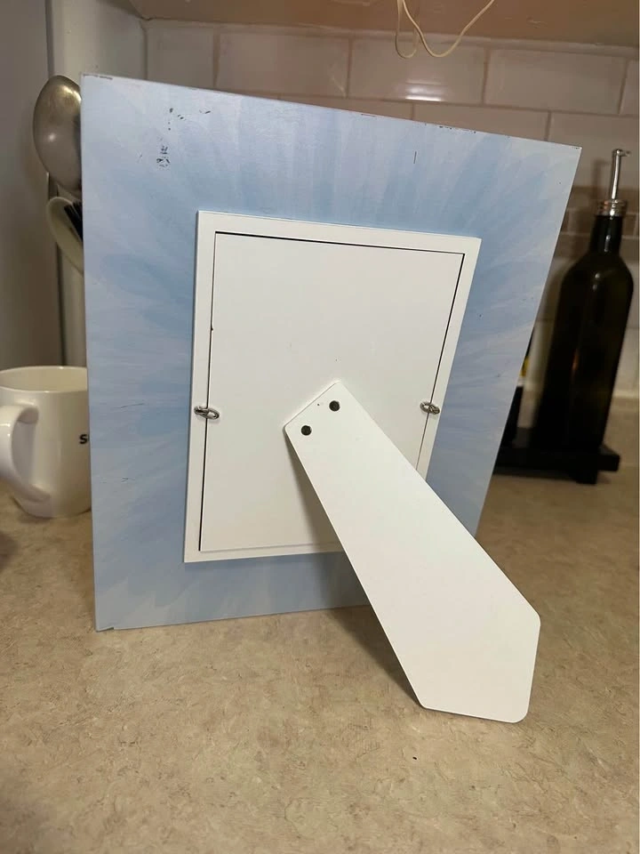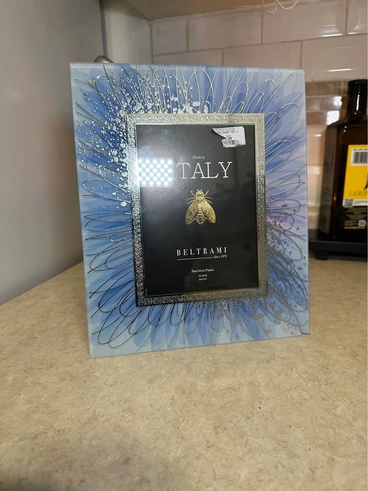 Beautiful Beltrami picture frame, made in Italy and real silver plated. Features a blue and silver design with a gold bee detail. Holds a 5x7 inch photo. The back has some light scuffs and a small chip on the bottom edge.