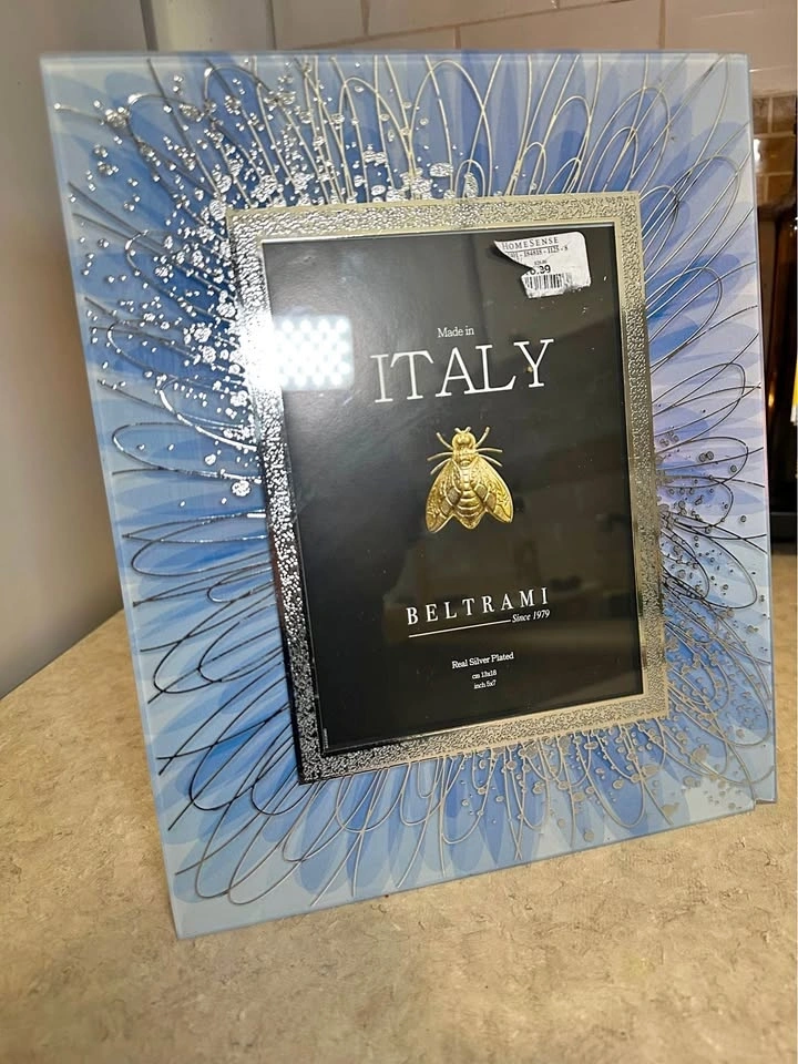 Beautiful Beltrami picture frame, made in Italy and real silver plated. Features a blue and silver design with a gold bee detail. Holds a 5x7 inch photo. The back has some light scuffs and a small chip on the bottom edge.