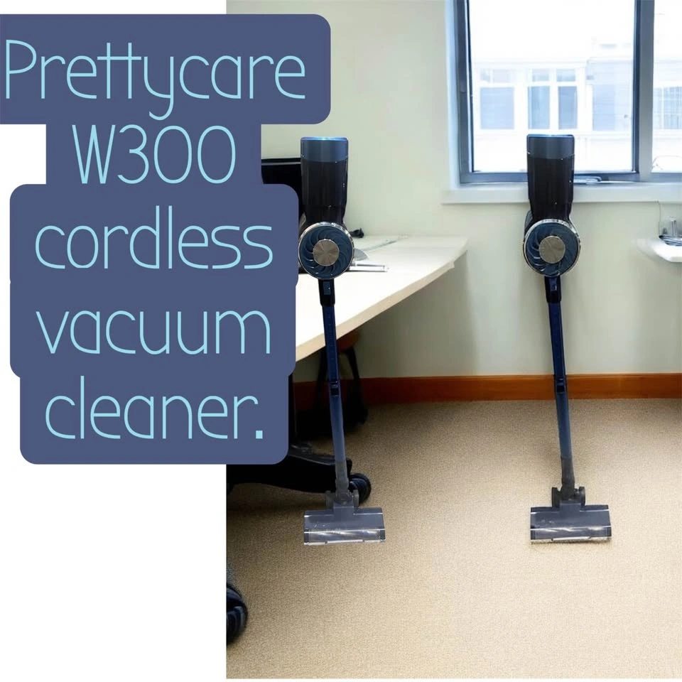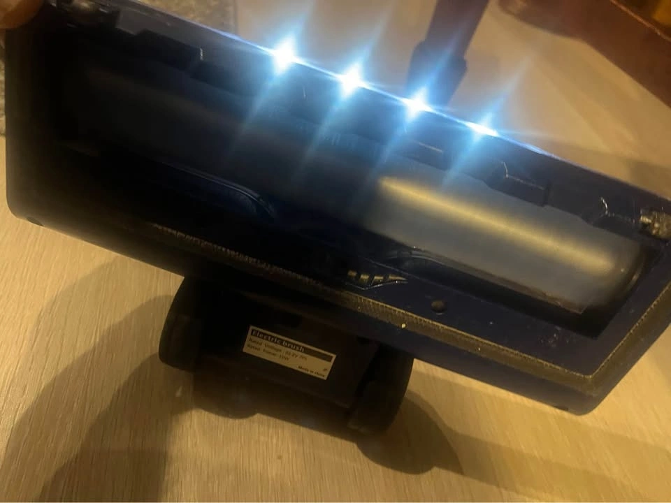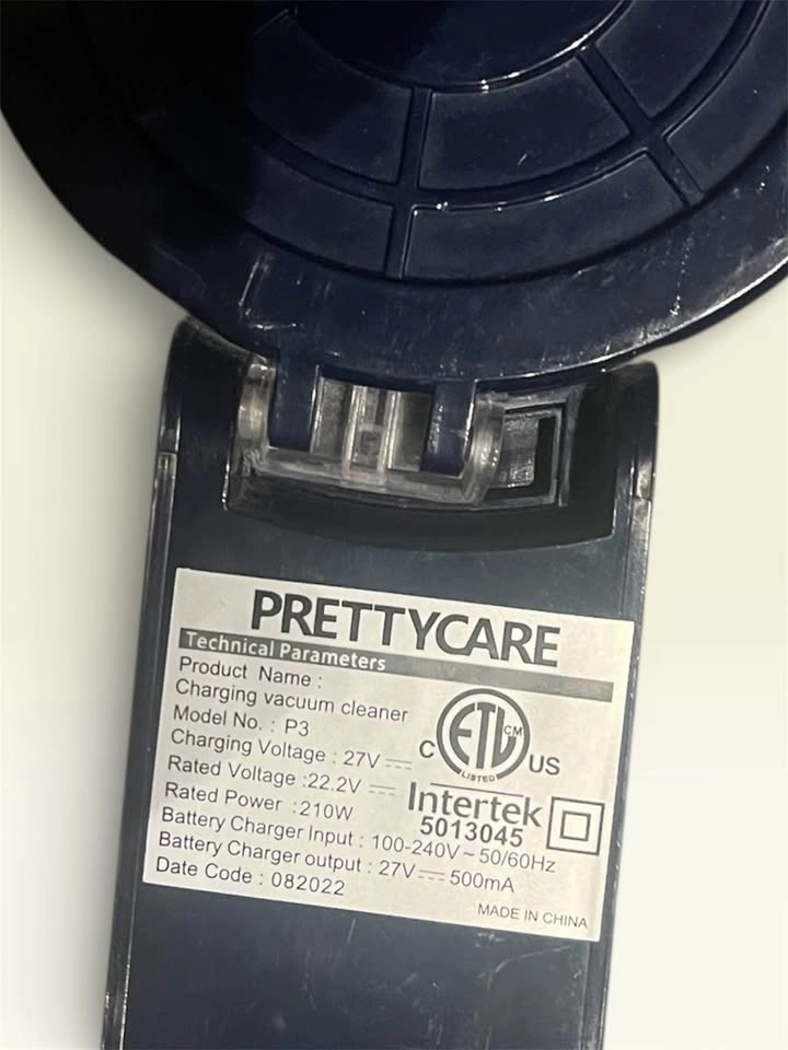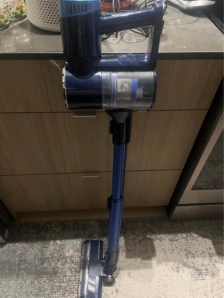 Great cordless vacuum cleaner! Dark blue with a digital display on the battery. Has a long handle and comes with attachments. Works well, some minor signs of use.