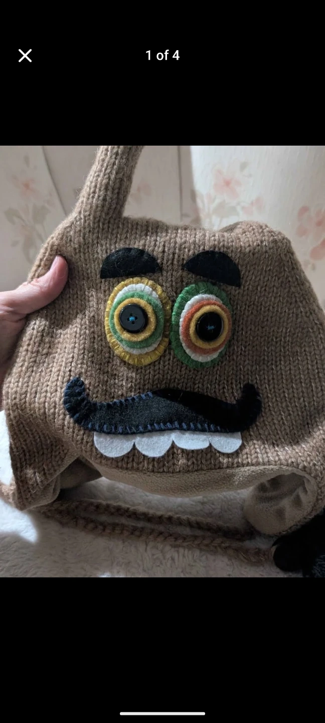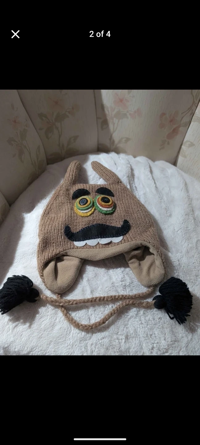 This DeLux knitted hat is designed for kids and features a fun monster face. It's made with a blend of 80% wool and 20% nylon for warmth. The hat includes ear flaps and ties with pom-poms. It's lined for extra comfort.
