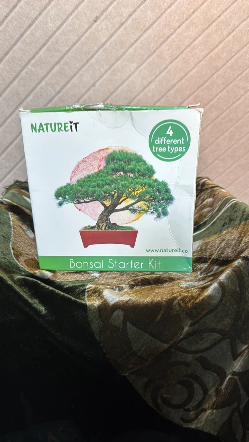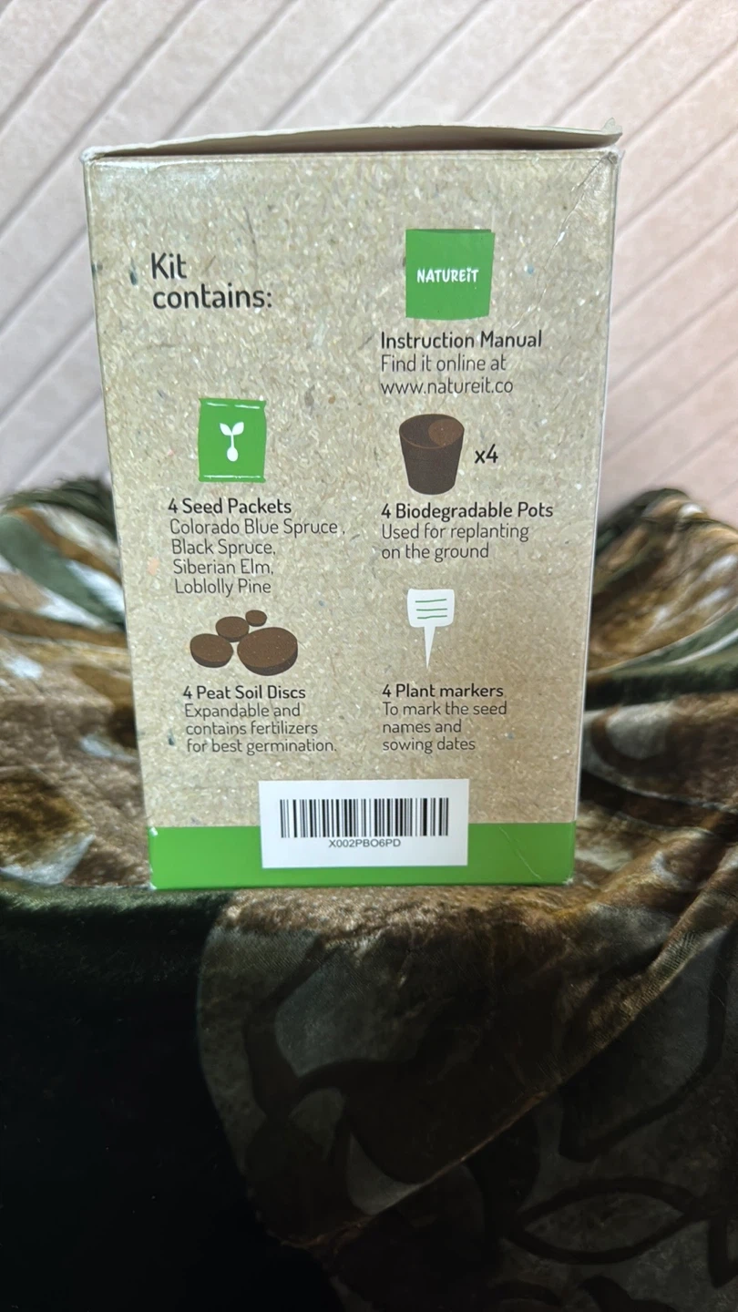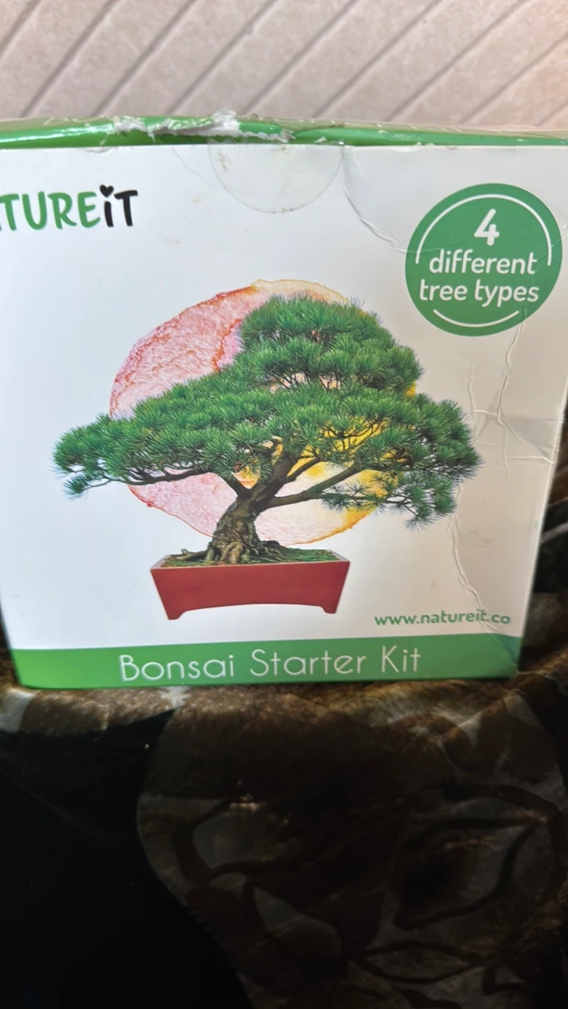This NatureiT Bonsai Starter Kit includes 4 different tree types. It contains 4 seed packets for Colorado Blue Spruce, Black Spruce, Siberian Elm, and Loblolly Pine. You also get 4 peat soil discs and 4 biodegradable pots for replanting, plus 4 plant markers. An instruction manual is included for guidance. Box is a bit bashed but everything inside is perfect.