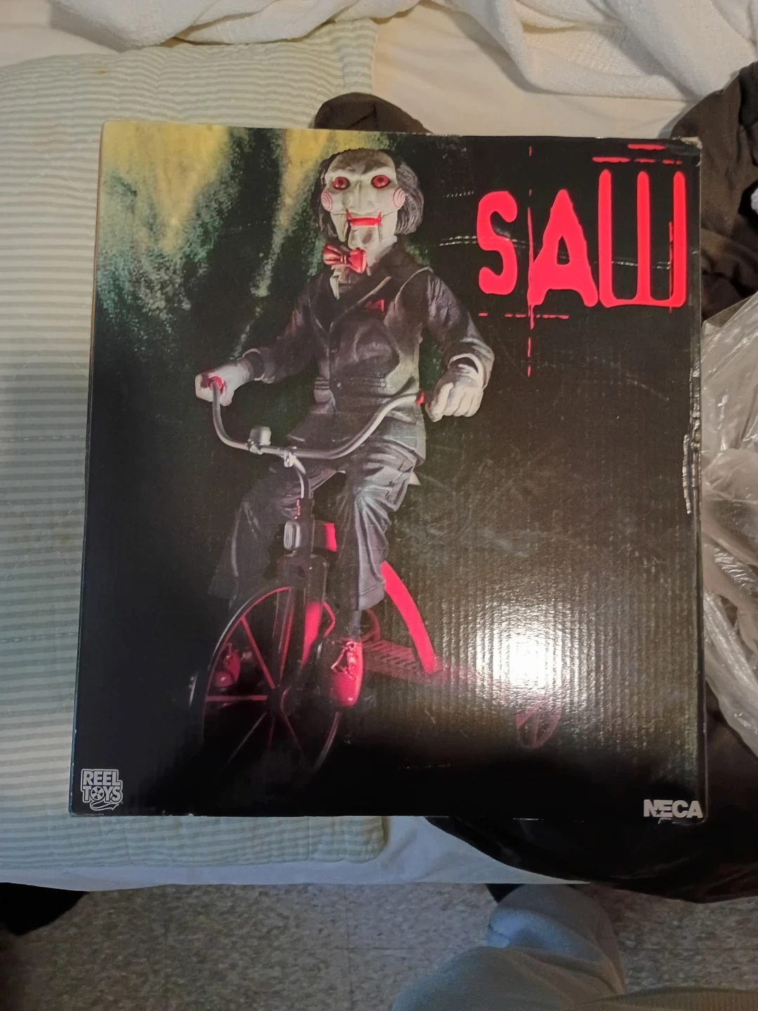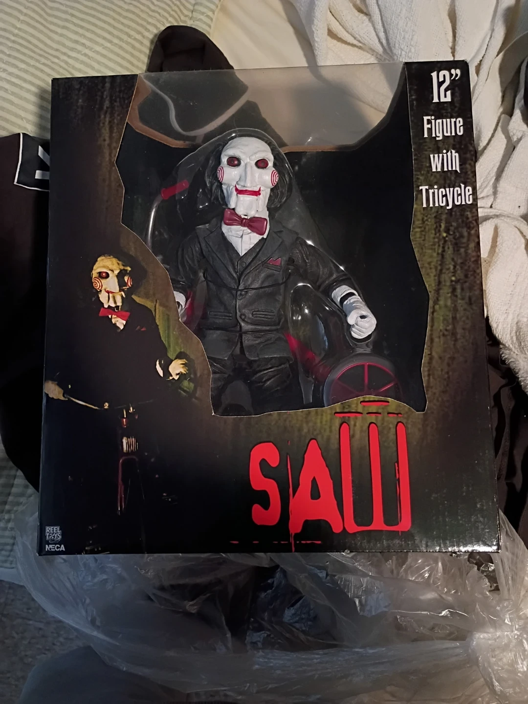 This is the NECA 12" Billy the Puppet figure from the Saw movies. It includes the iconic tricycle he rides. A must-have for any horror fan's collection!