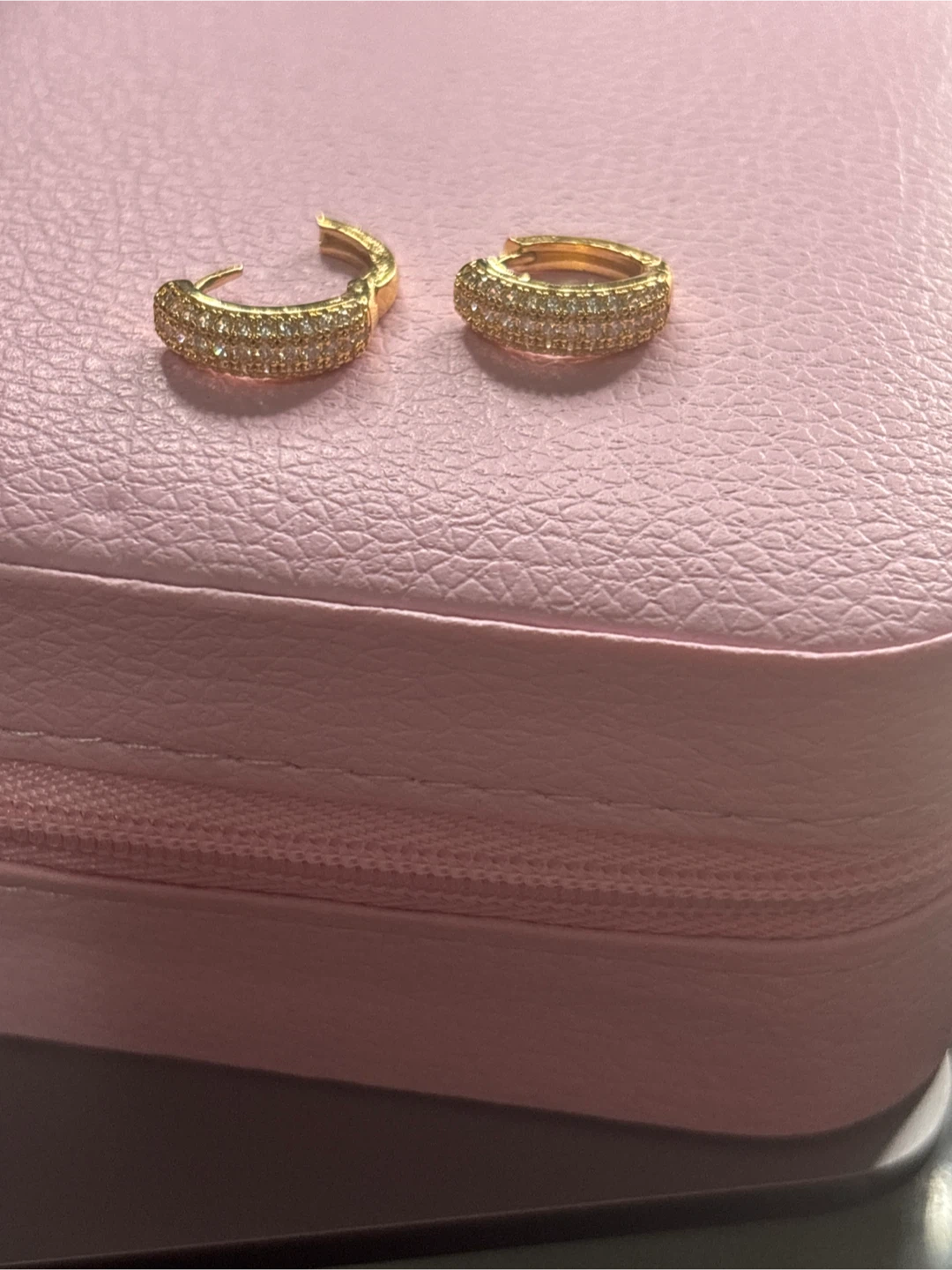 Sparkly gold hoop earrings set with small rhinestones. These dainty hoops add a touch of bling to any outfit. They're a classic accessory for everyday wear or special occasions!