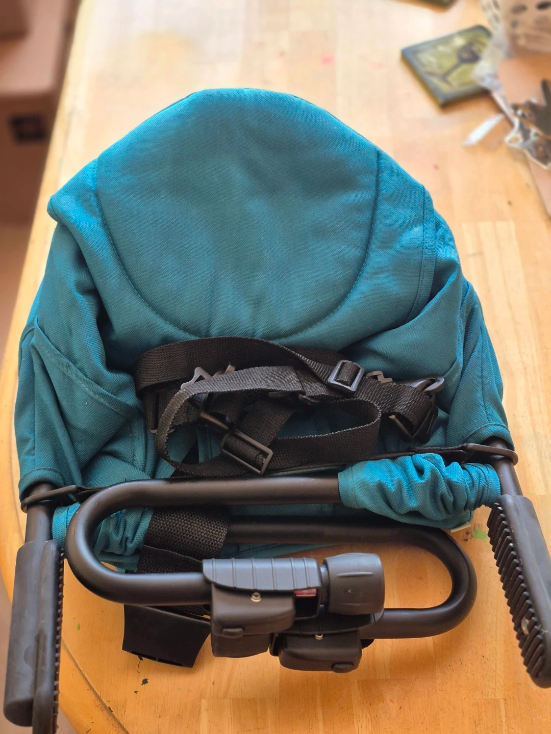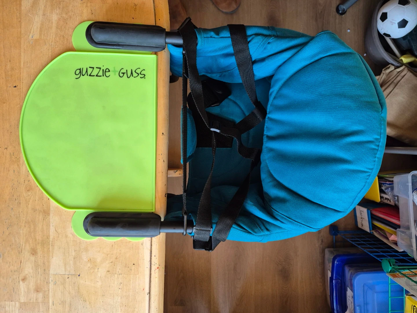 Selling a Guzzie+Guss Perch Hook-on High Chair! This chair is great for saving space and easy to bring when travelling or going out to eat. It easily attaches to most tables, making mealtimes with your little one a breeze. Includes travel bag and silicone placemat. See instructions pictures for appropriate table thickness for use.