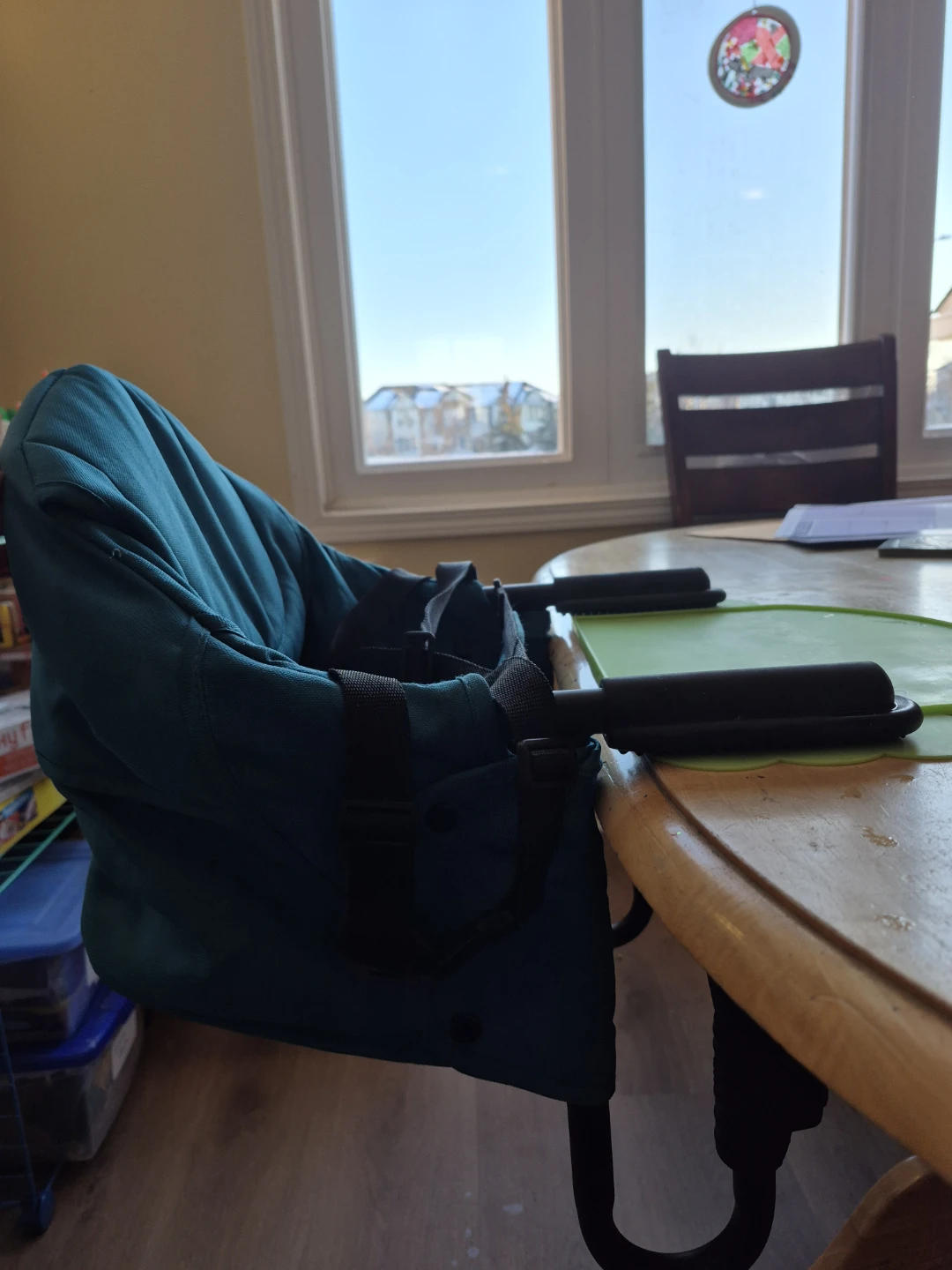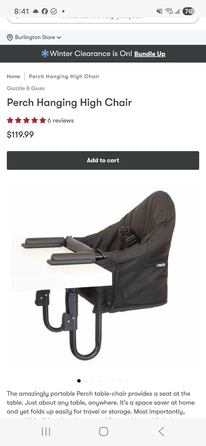 Selling a Guzzie+Guss Perch Hook-on High Chair! This chair is great for saving space and easy to bring when travelling or going out to eat. It easily attaches to most tables, making mealtimes with your little one a breeze. Includes travel bag and silicone placemat. See instructions pictures for appropriate table thickness for use.