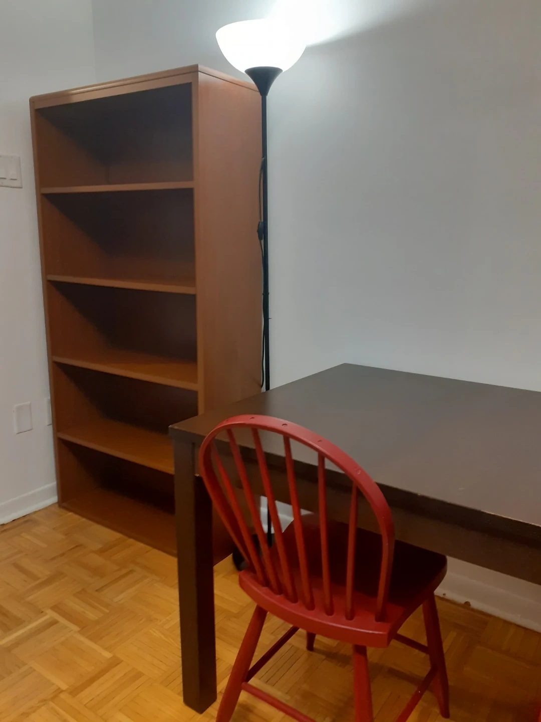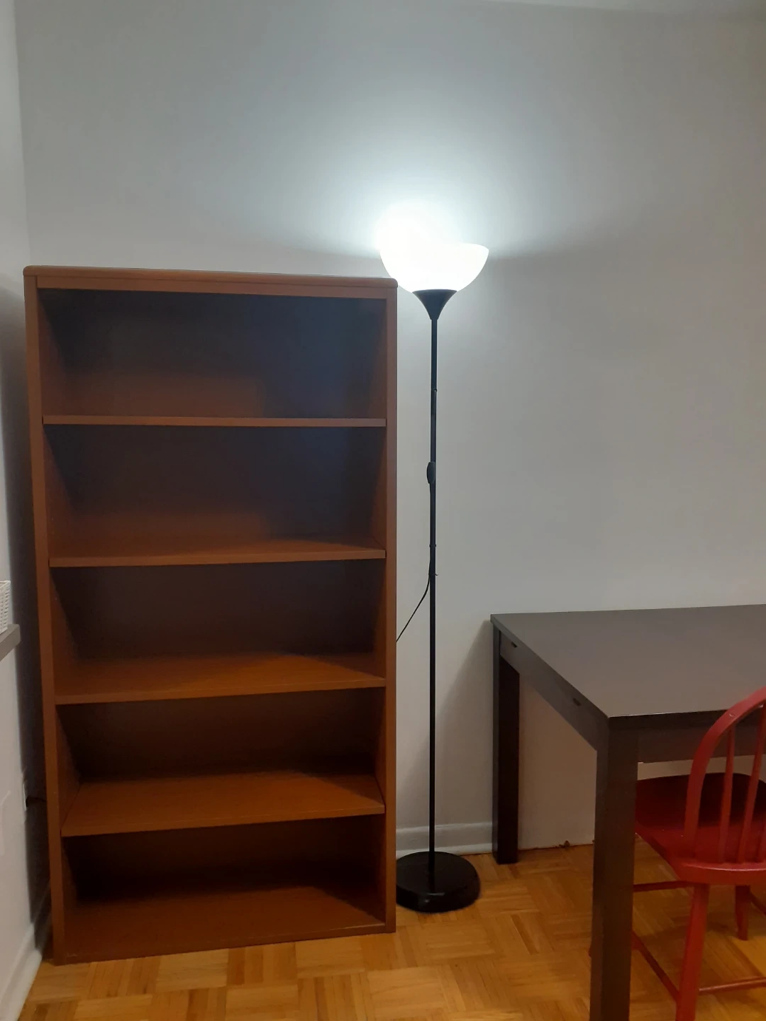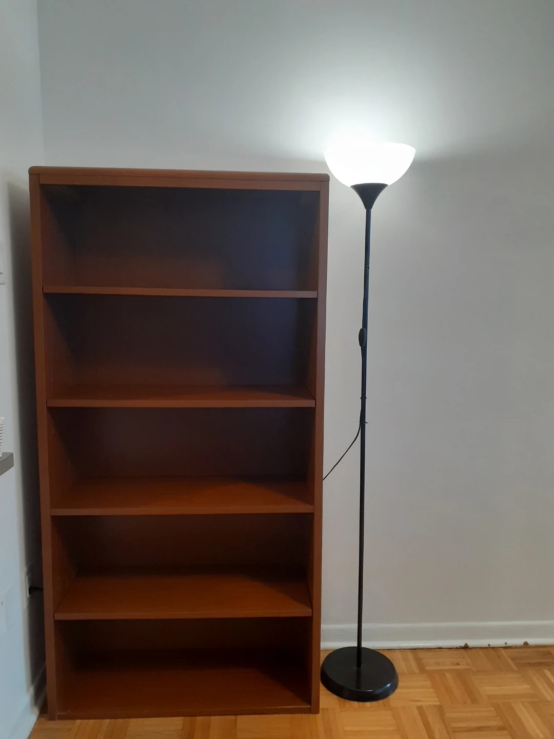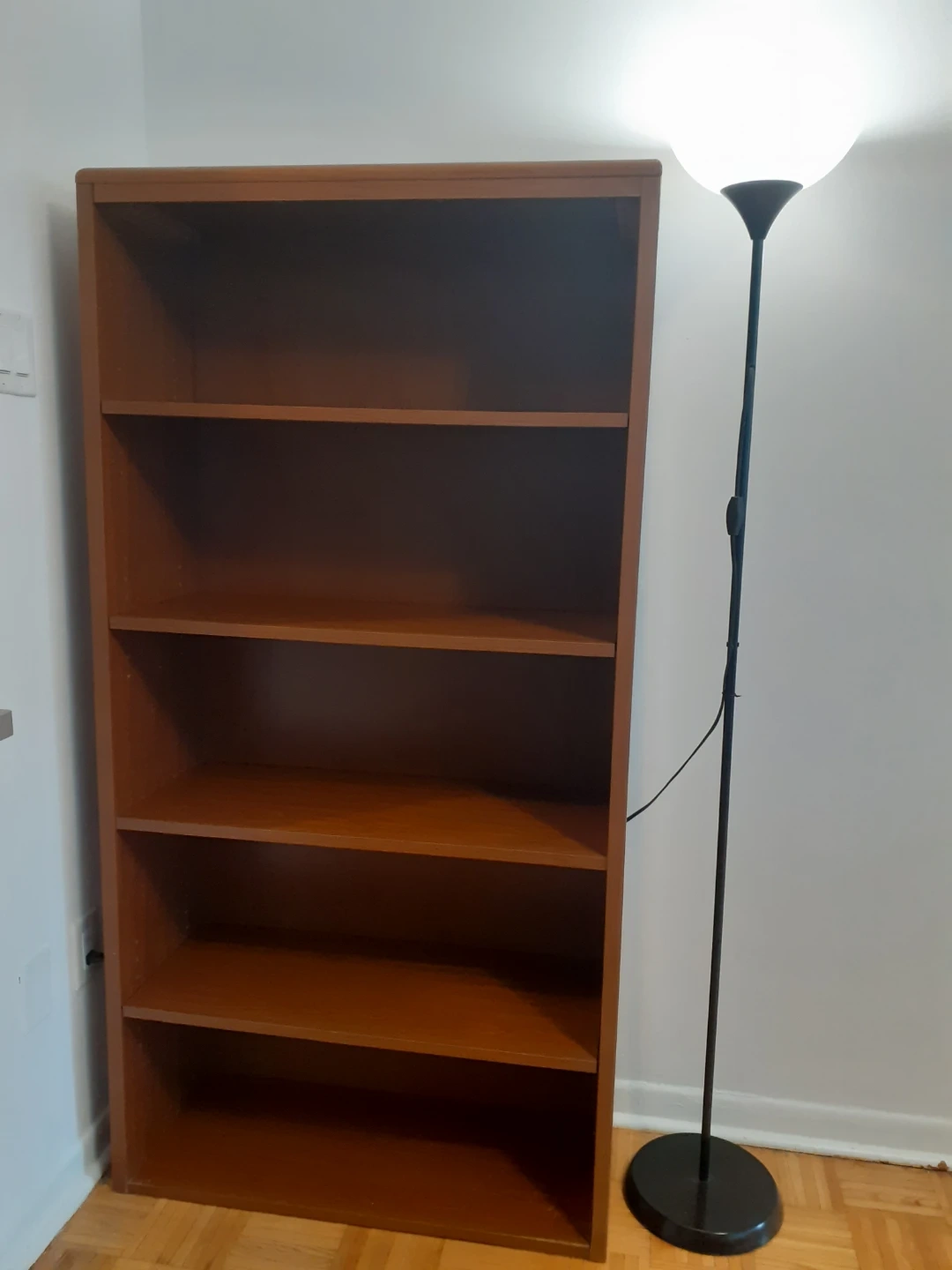 This is a 5-shelf wooden bookshelf with a warm brown finish. It's sturdy and ready for your books or decor. A simple, classic piece for any room!