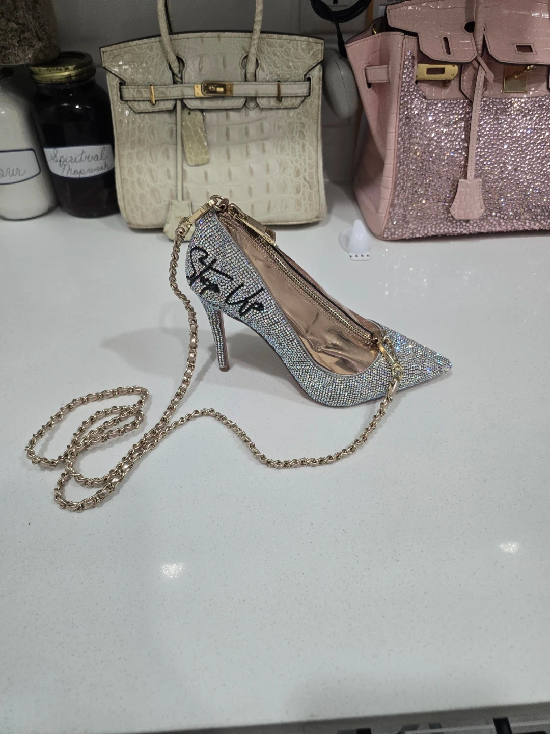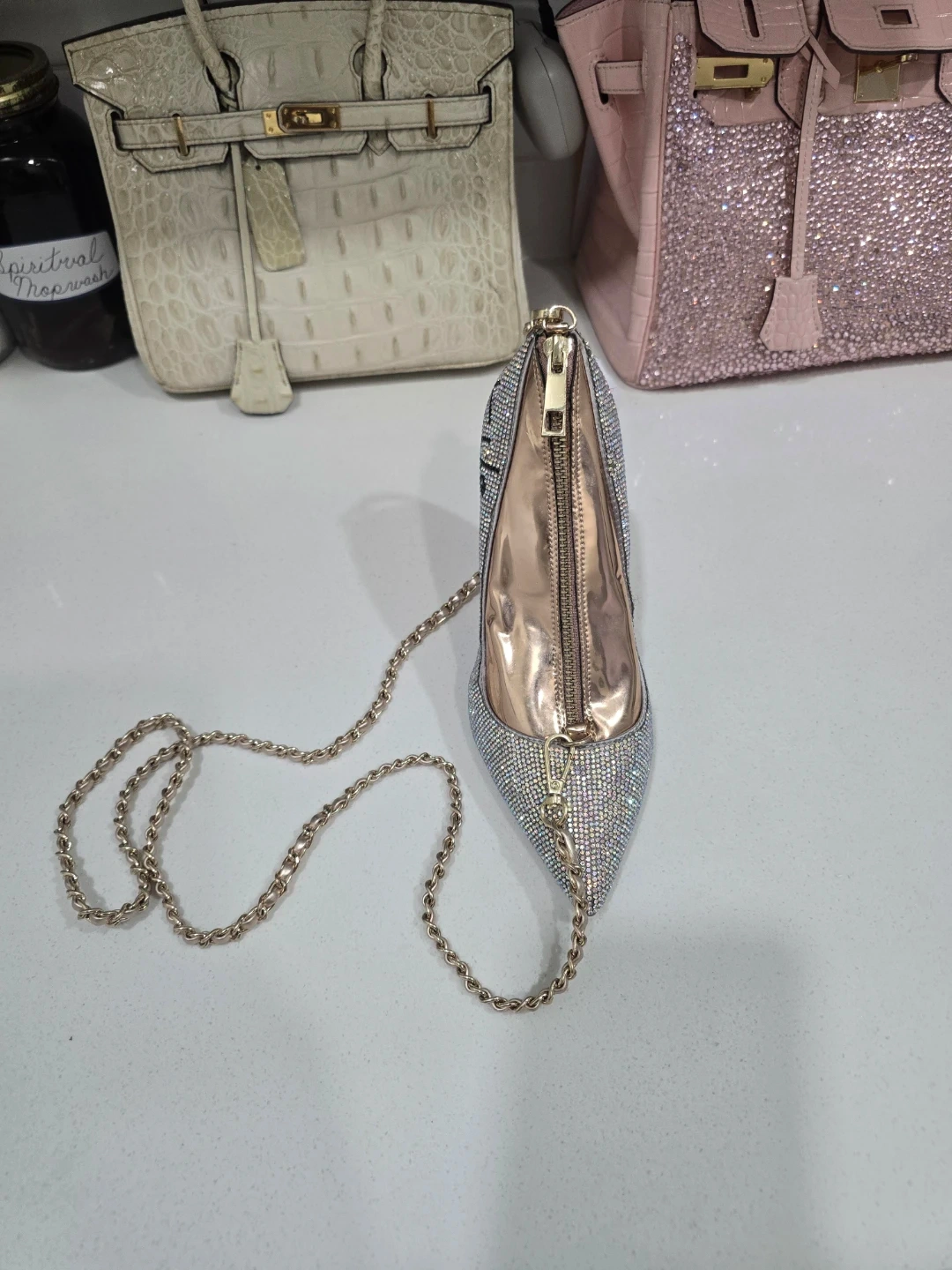 This unique clutch is designed in the shape of a sparkling high heel shoe. It's covered in rhinestones and features a zipper closure. A detachable gold-tone chain strap is included for convenient carrying. It's a fun accessory for parties or special occasions!Firm on price and will not accept lowballs.