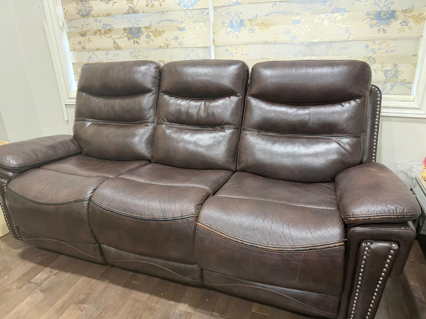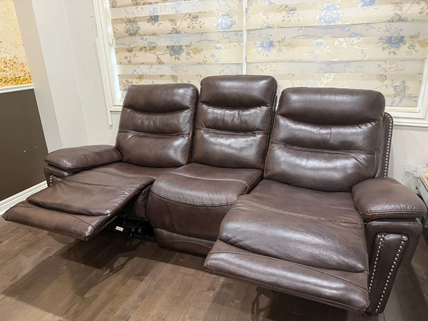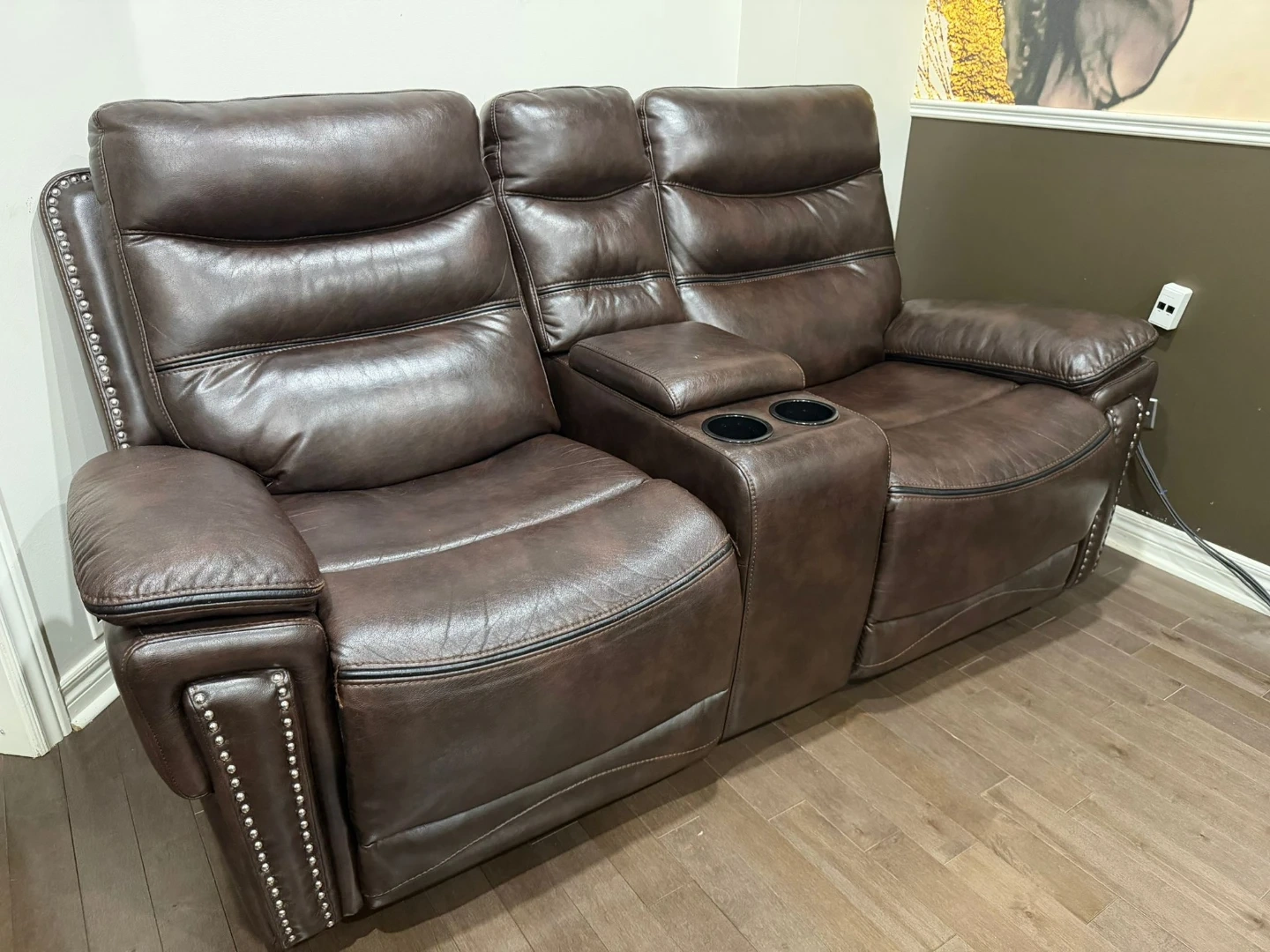 This comfortable three-seater reclining sofa is upholstered in brown faux leather and features tufted cushioning for added comfort. It includes a centre console with two cup holders and reclining seats on both ends for ultimate relaxation. Power controls with blue LED lights are integrated into the side panels. 3+2+1 and Dining table with 6 chairs in excellent condition