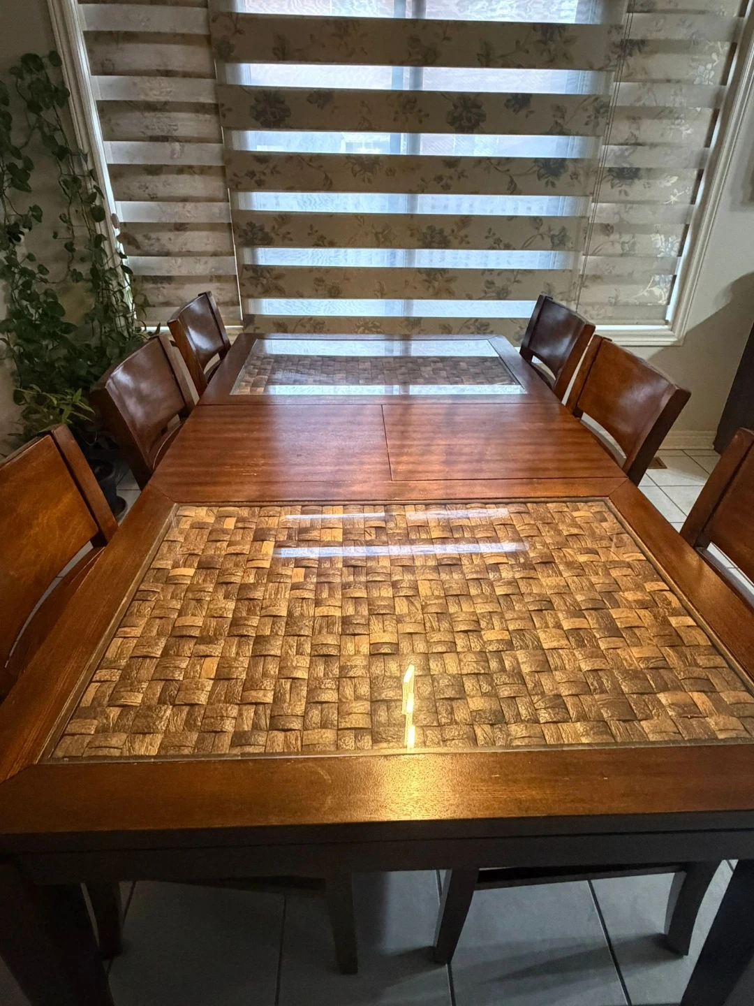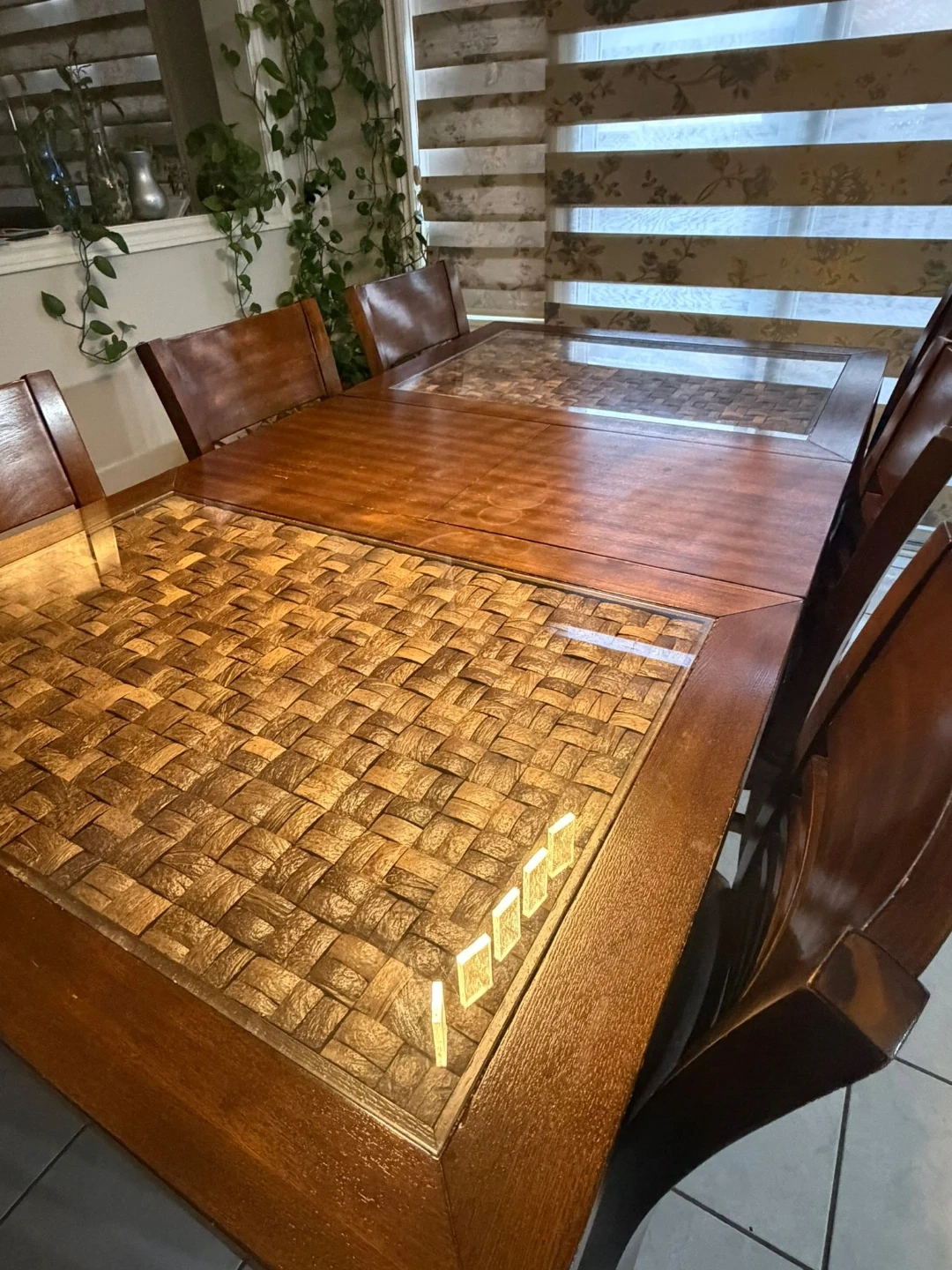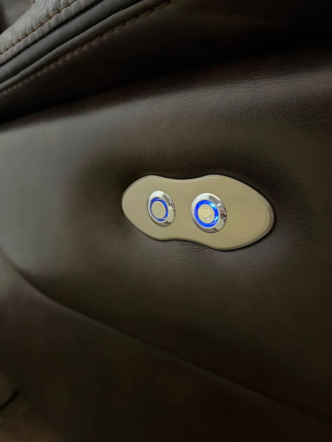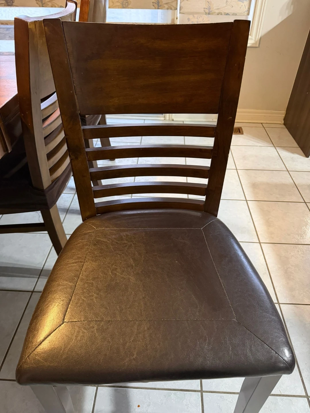This comfortable three-seater reclining sofa is upholstered in brown faux leather and features tufted cushioning for added comfort. It includes a centre console with two cup holders and reclining seats on both ends for ultimate relaxation. Power controls with blue LED lights are integrated into the side panels. 3+2+1 and Dining table with 6 chairs in excellent condition