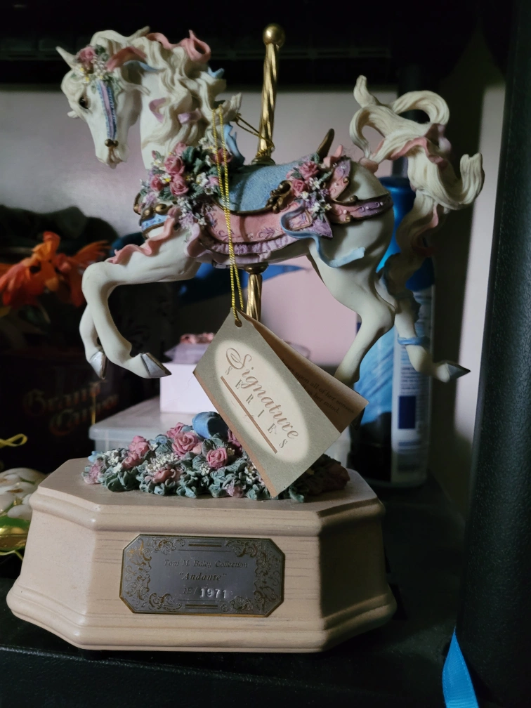 This is a lovely Toni M. Bailey Collection "Andante" carousel from 1971. It's a Westland item, number 5122, and plays Canon in D. A beautiful piece for any collector!