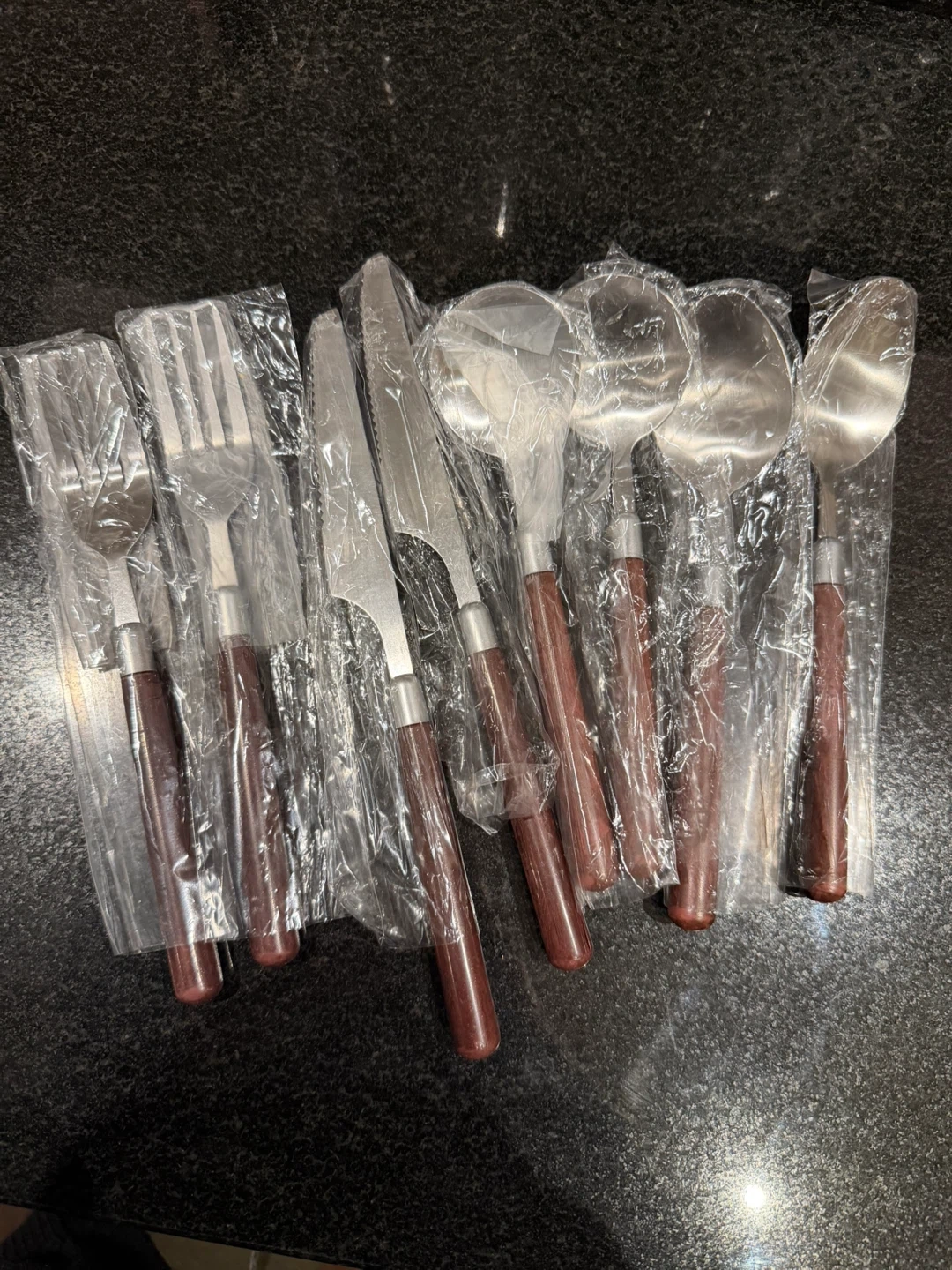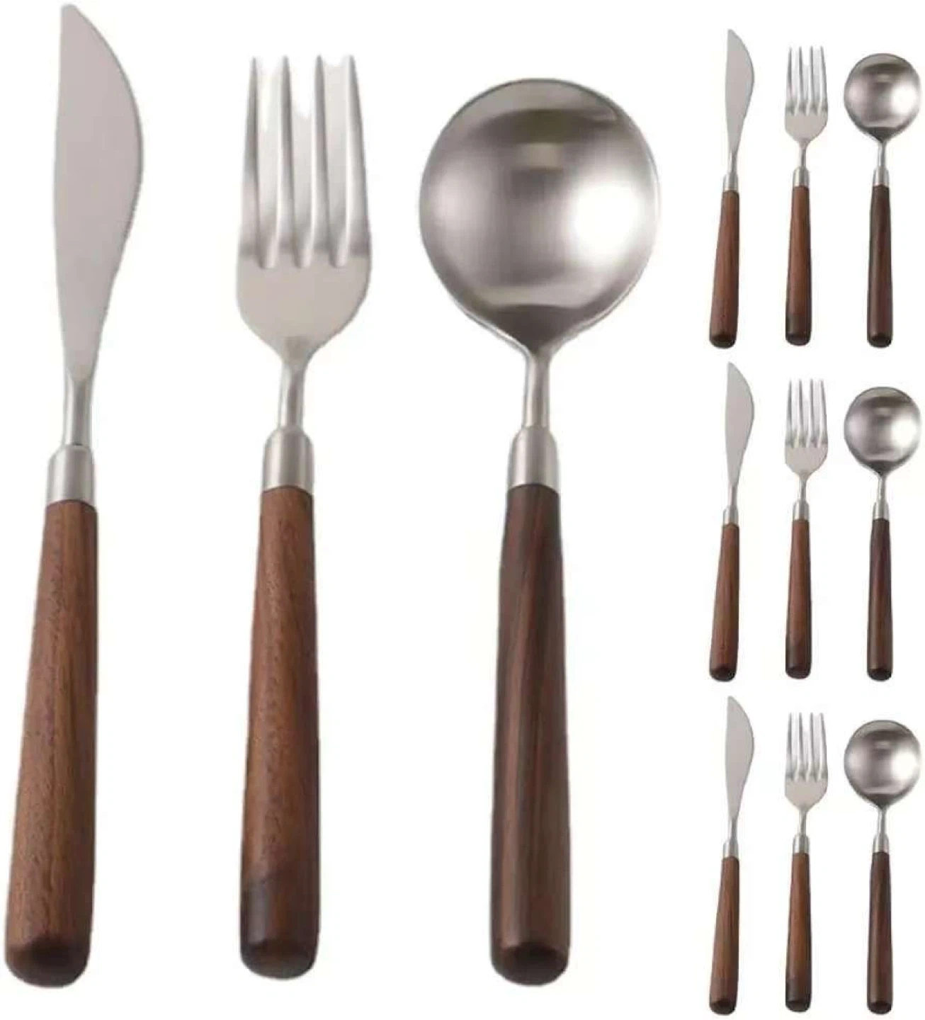 Four-piece cutlery set featuring stainless steel heads and dark wood handles. Includes two knives, 2 forks, and two round spoons, and two oval spoons. Durable and stylish for everyday use!