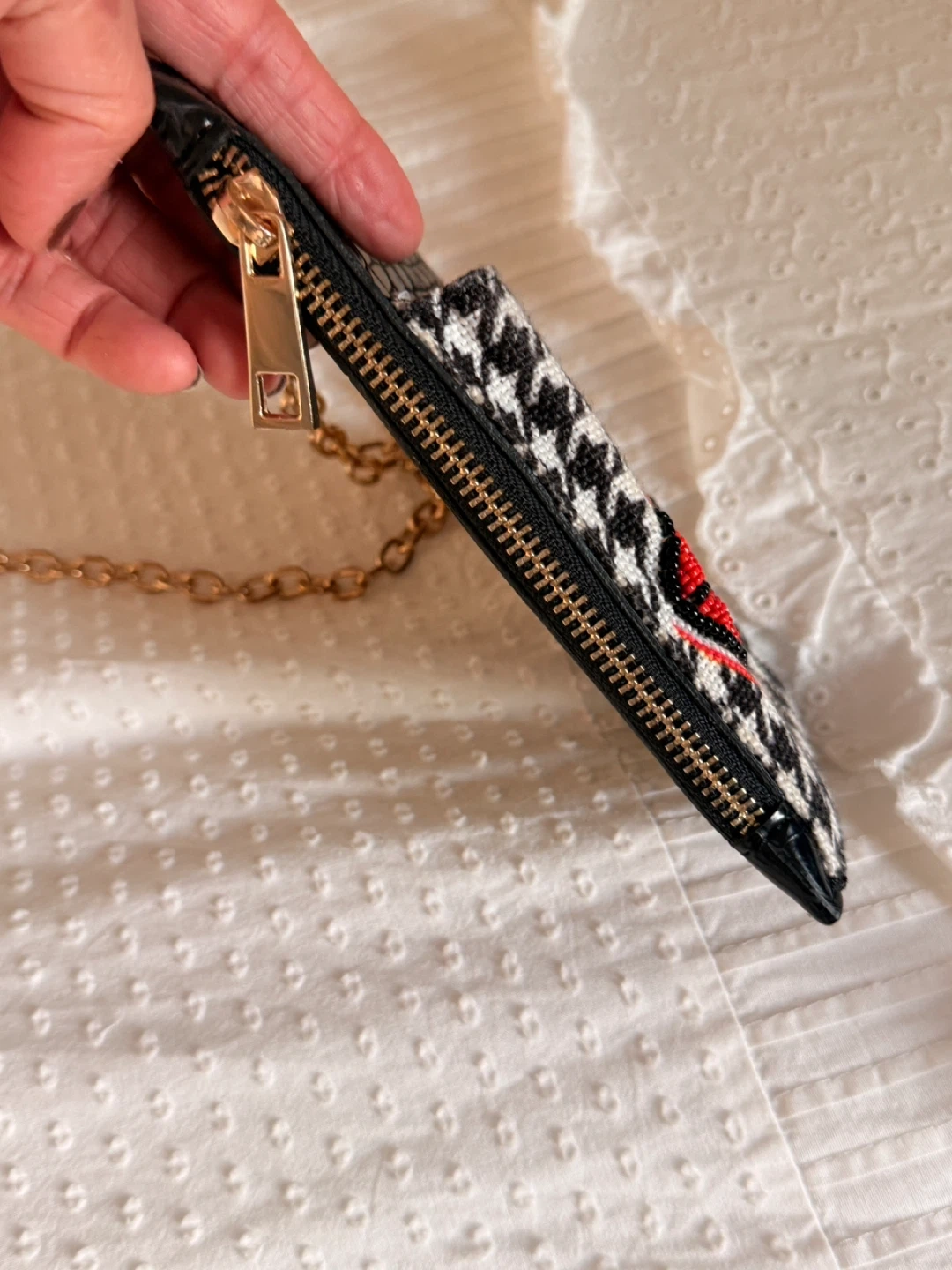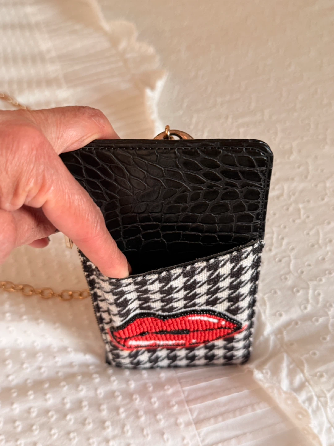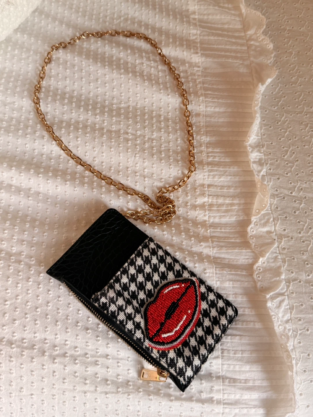 This small chain wallet is black with a houndstooth pattern and a beaded red lips design. It includes a detachable gold-tone chain. It's perfect for carrying essentials when you don't want to bring a large bag!