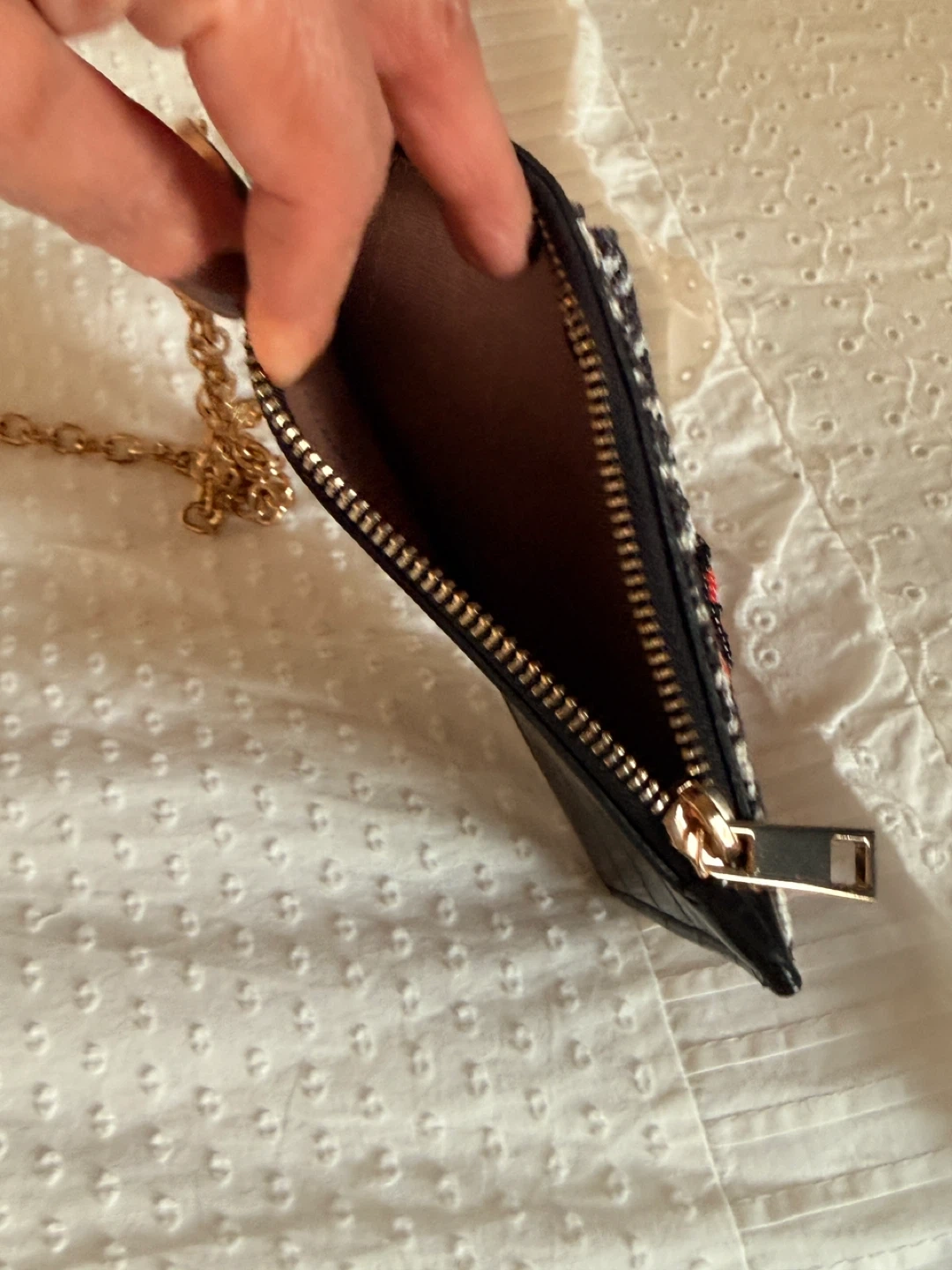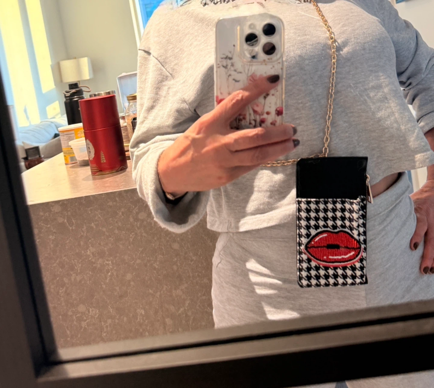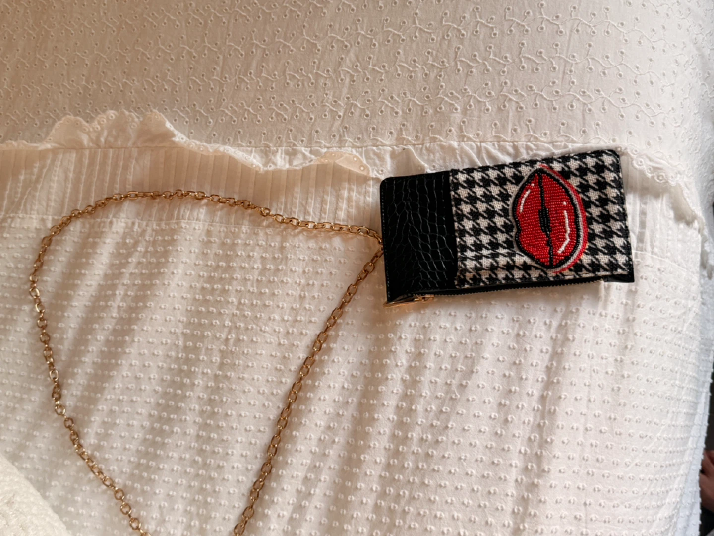 This small chain wallet is black with a houndstooth pattern and a beaded red lips design. It includes a detachable gold-tone chain. It's perfect for carrying essentials when you don't want to bring a large bag!