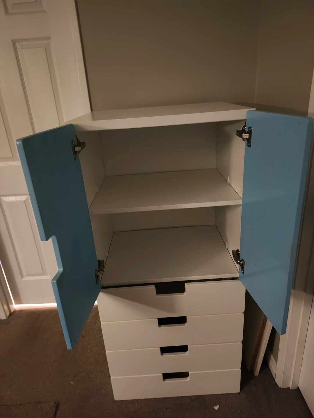 This storage cabinet features two blue doors and four white drawers. It has two shelves inside the cupboard space. The blue doors have simple cut-out handles.