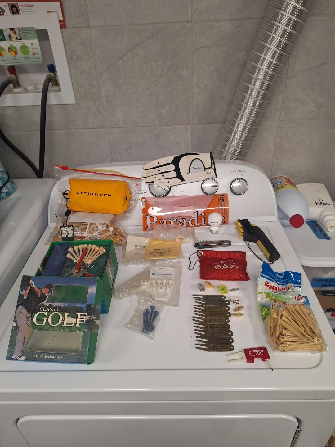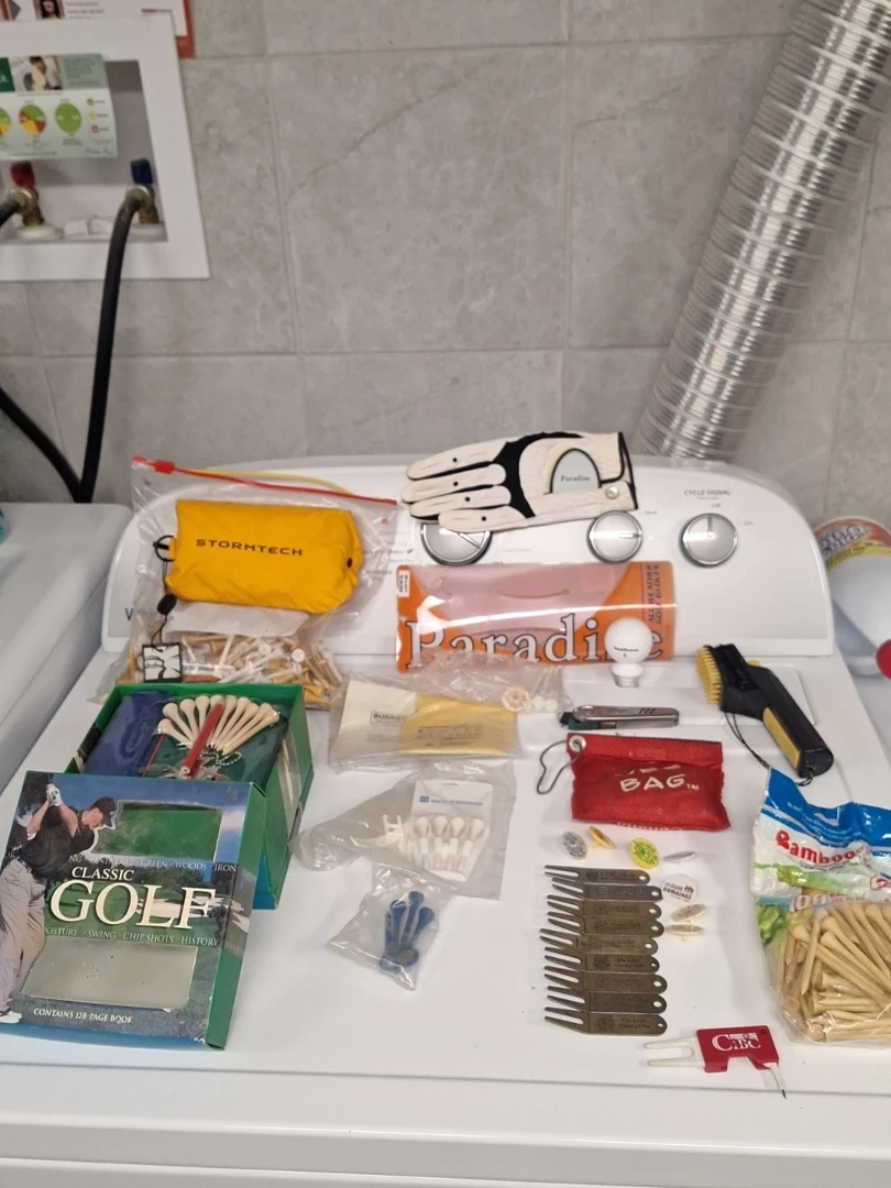 This bundle includes various golf accessories, featuring tees, markers, a left handed golf glove, turf tools, club cleaner, jacket, brand new balls. Perfect for any golfer looking to stock up on essentials!